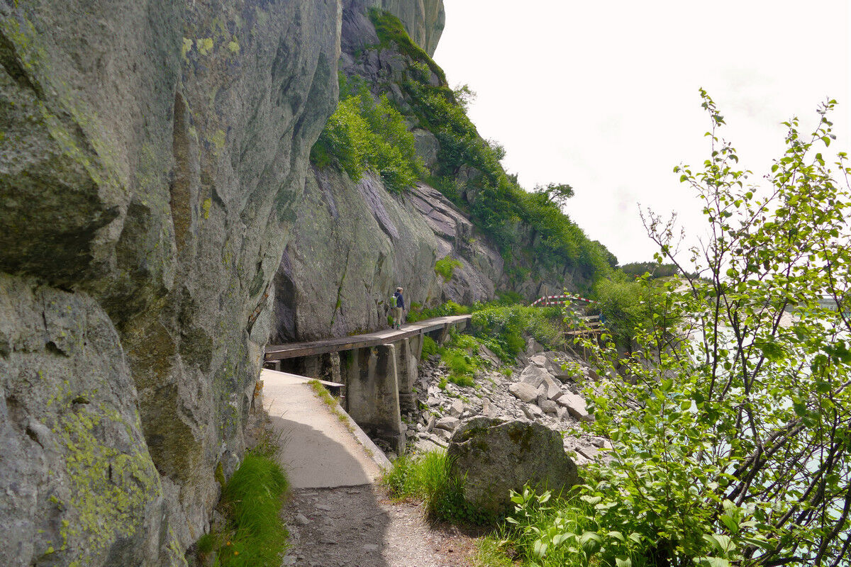 Nun führt uns die Route durch ein Steinschlaggebiet, wir nähern uns der Schlüsselstelle. Nah an der glatten Felswand direkt über dem Gelmersee ist der Weg ausgesprengt. Die kurze, aber spektakuläre Passage ist mit Drahtseilen gesichert. Wenig später überqueren wir den Alplibach, ab hier geht es in leichtem Auf und Ab am Ufer des Sees entlang zurück bis zur Staumauer,