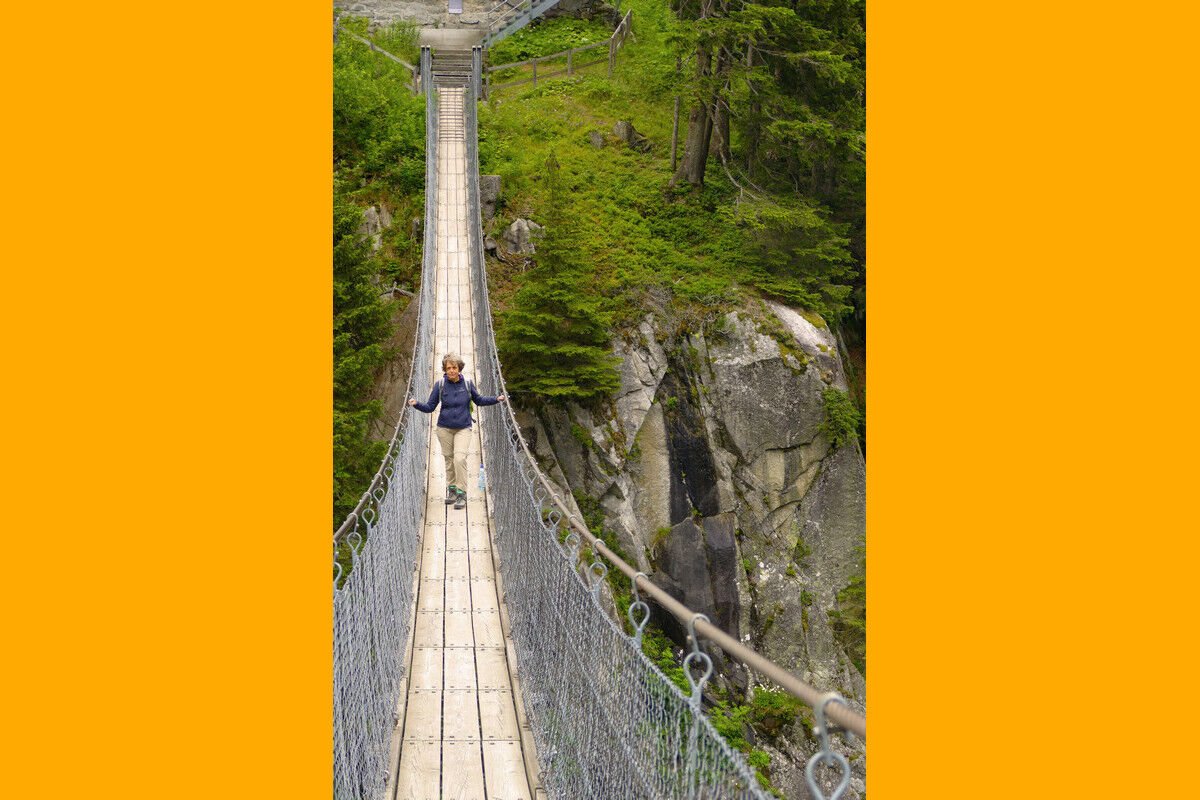 Die Handeckfall-Hängebrücke iste eine echte Adrenalinbrücke. Den Namen hat die Hängebrücke zum einen wegen der Ortsbezeichnung Handeck (Handegg) und zum anderen, weil sie mehrere Wasserfälle überquert. Die Brücke überspannt das Flüsschen Aare in 70 Metern Höhe, genau an der Stelle, wo sich der Fluss bei einem Sturz in 56 Meter Tiefe mit dem Aerlenbach vereint.