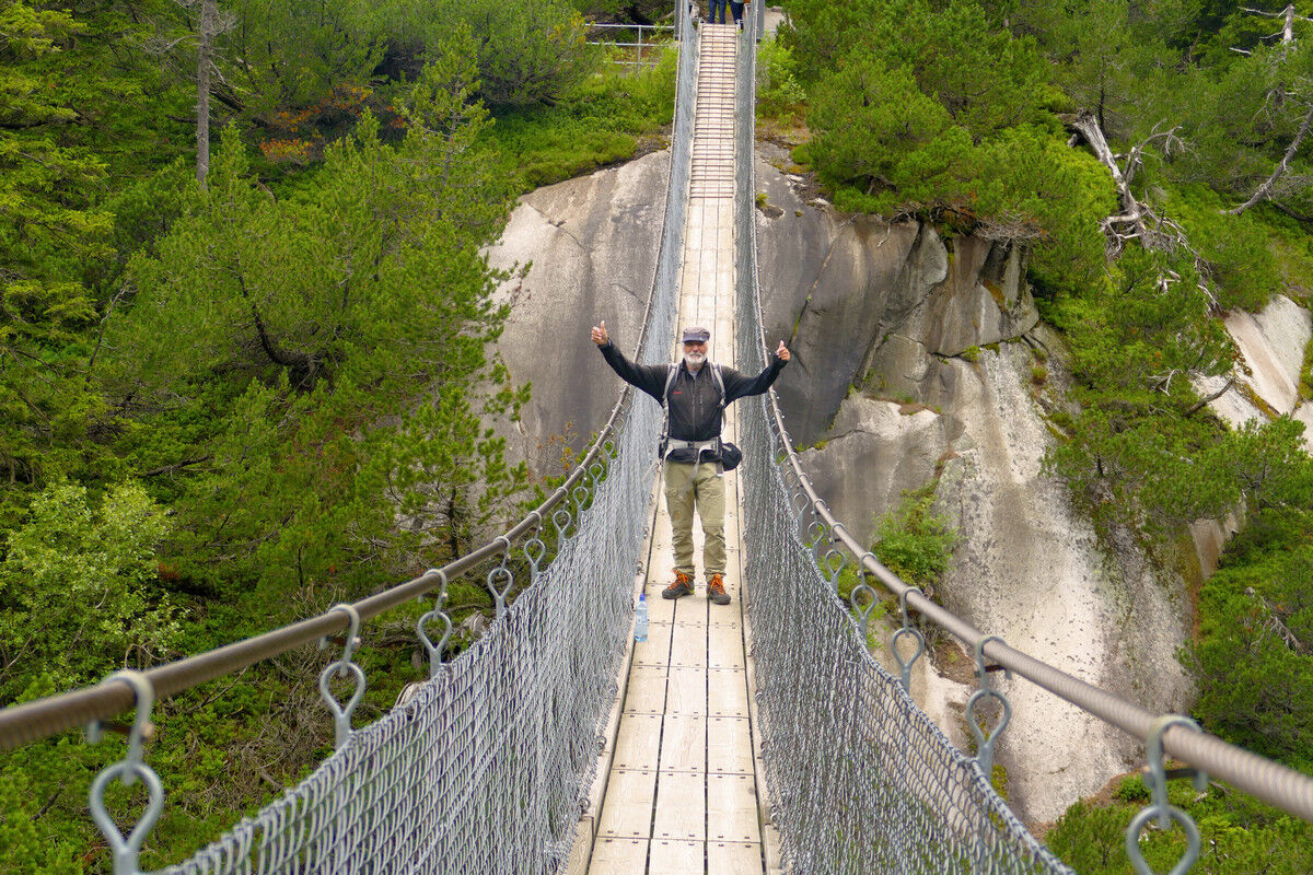 Nervenkitzel pur erleben wir gleich zu Beginn unserer Wanderung: mit der Gelmerbahn, der steilsten offenen Standseilbahn Europas fahren wir ruckelnd mit einer maximalen Steigung von 106 Prozent im offenen Wagen zum Gelmersee empor. Von hier führt die Rundwanderung um den Gelmersee zurück zur Staumauer. Auch der Abstieg ist Nervenkitzel: steil wandern wir auf schmalem Steig mit vielen Steinstufen abwärts nach Chüenzentennlen an der Grimselstraße. Weiter nach Handegg folgen wir dann dem alten Grimsel-Saumweg. Hier erwartet uns dann der letzte Nervenkitzel: auf der Handeckfall-Hängeseilbrücke überqueren wir die Aare, mehrere Wasserfälle und die Grimselpass-Straße.