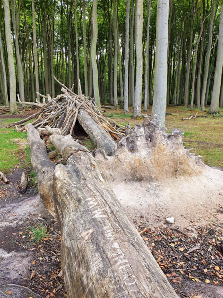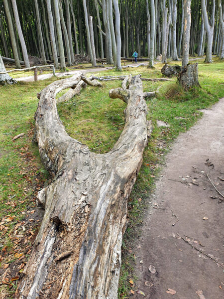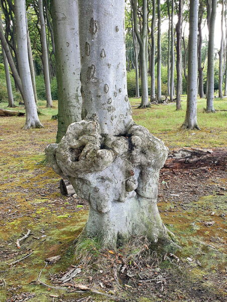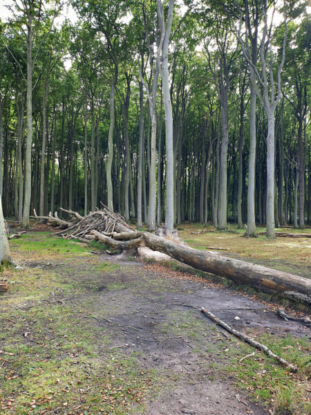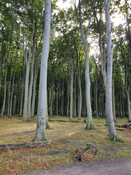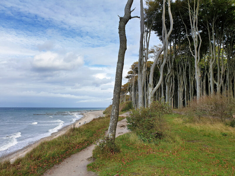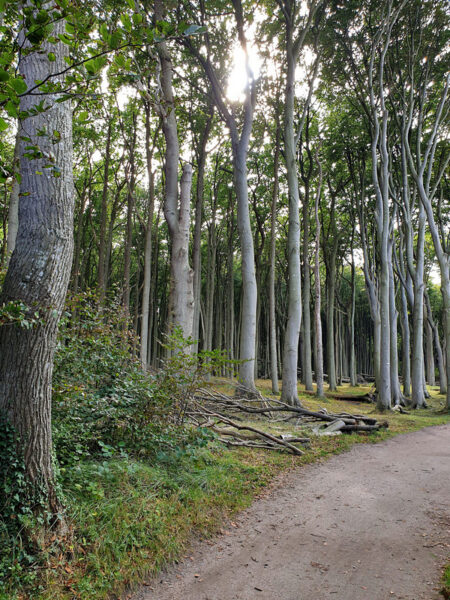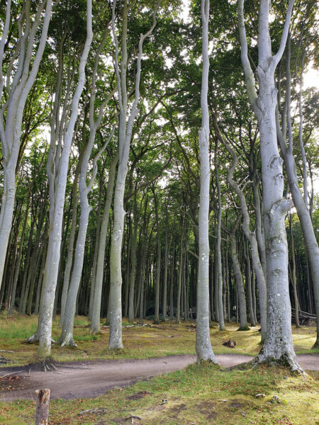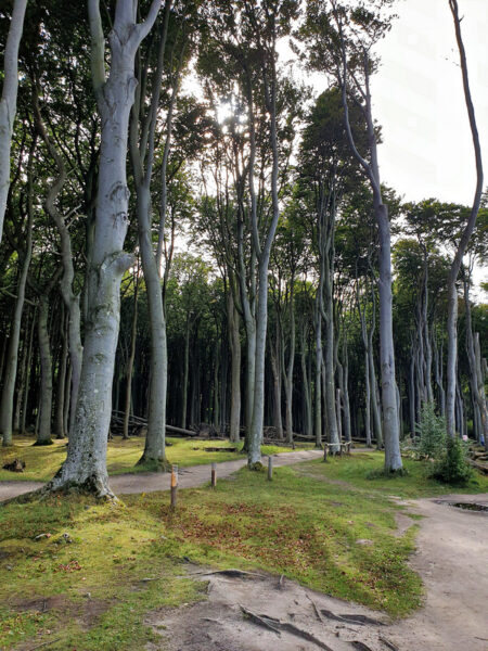 Doch mit jedem Schritt verändert sich die Atmosphäre. Die hohen Buchen und Eschen stehen nun weiter auseinander, ihre Stämme und Äste sind vom Wind der Ostsee gebogen, geglättet und vom Salz hell geschliffen. Das Licht wird diffuser, die Luft stiller, und plötzlich scheint alles um mich herum in einer geheimnisvollen Spannung zu liegen. In solchen Momenten – bei Dämmerung, Nebel oder Sturm – mag man glauben, dass sich hier einst Geschichten von Geistern und Fabelwesen gewoben haben.