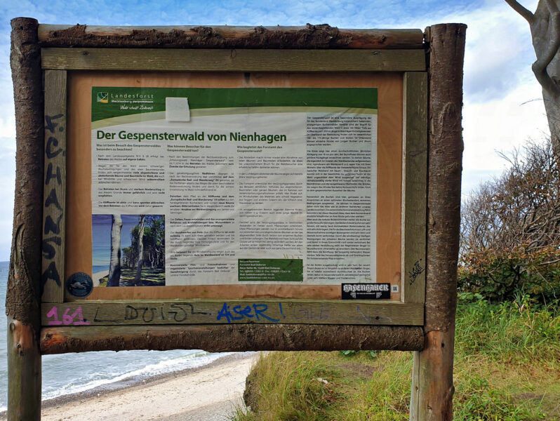 Wie kam der Wald zu seinem geheimnisvollen Namen? Die Antwort offenbart sich mir, als ich in Nienhagen zu meiner Wanderung aufbreche. Der Weg entlang der Steilküste ist angenehm zu gehen, fester Boden, keine Steigungen, nur das stetige Rauschen der Ostsee begleitet mich. Bald erreiche ich ein Informationsschild und trete in den Wald ein, der hier zunächst noch ganz gewöhnlich wirkt.