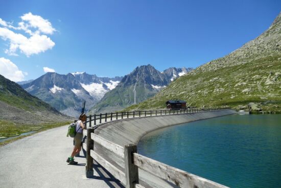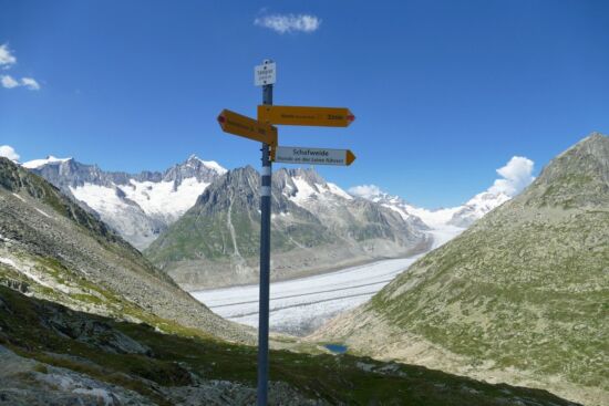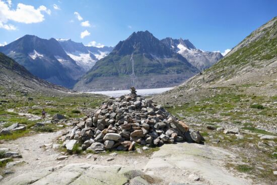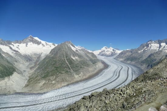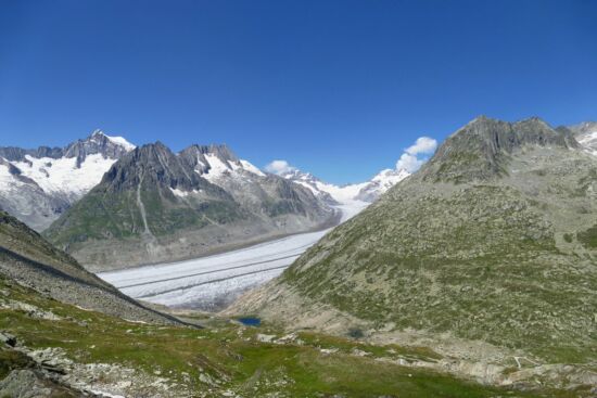 Alleine die Aussicht auf den Grossen Aletschgletscher verleiht dieser Wanderung genug Spektakel. Der Blick reicht nicht nur bis zu Eiger, Mönch und Jungfrau, die hinter dem Konkordiaplatz hervorragen, sondern auch bis zum Fieschergletscher, der ein Tal weiter ostlich zu finden ist. Der Grosse Aletschgletscher ist der flächenmässig grösste und längste Gletscher der Alpen. Die Länge des Gletschers beträgt 22,75 km, die Fläche einschliesslich der Quellgletscher wird mit 81,7 km² angegeben.