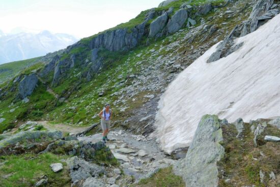 Nach einem ausgiebigen Genuß des Panoramas machen wir uns auf den Weg durch Geröllfelder zur Gletscherstube am Märjelensee. Leider ist der direkte Weg zum Tälligrat wegen Steinschlaggefahr gesperrt. So müssen wir einen Umweg in Kauf nehmen, der uns erst einige Höhenmeter abwärts führt und dann wieder steil zum Tälligrat hoch leitet. Die Aussicht vom Tälligrat lässt uns die Mühen recht schnell vergessen.