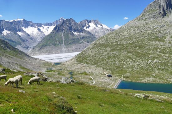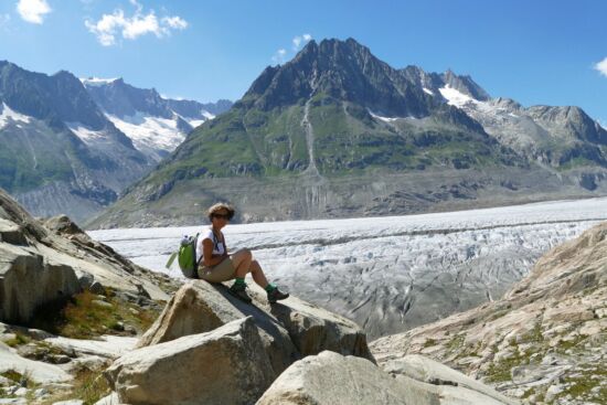 Mit der Bergbahn fahren wir ohne Anstrengung von Fiesch im Rhonetal hinauf zur Fiescheralp und weiter auf den Nordostgrat des Eggishorns. Der Rundumblick ist gigantisch: Grosser Aletschgletscher, Konkordiaplatz mit Eiger, Mönch und Jungfrau, Aletschhorn, der kälteste Berg der Schweiz, in der Ferne das Matterhorn. Bedrückend zu sehen, wie stark der Gletscher mittlerweile abgeschmolzen ist.