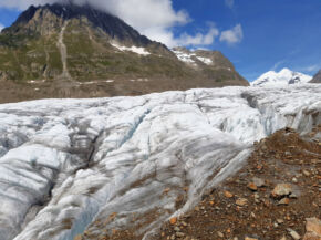 Der Grosse Aletschgletscher in den Berner Alpen im Schweizer Kanton Wallis ist der flächenmässig grösste und längste Gletscher der Alpen: 22 km ist der Gletscher lang, 10 Milliarden Tonnen ist das Gewicht des Grossen Aletschgletschers, 800 Meter tief ist das dickste Eis am Konkordiaplatz, 79 Quadratkilometer misst die Fläche des Grossen Aletschgletschers.