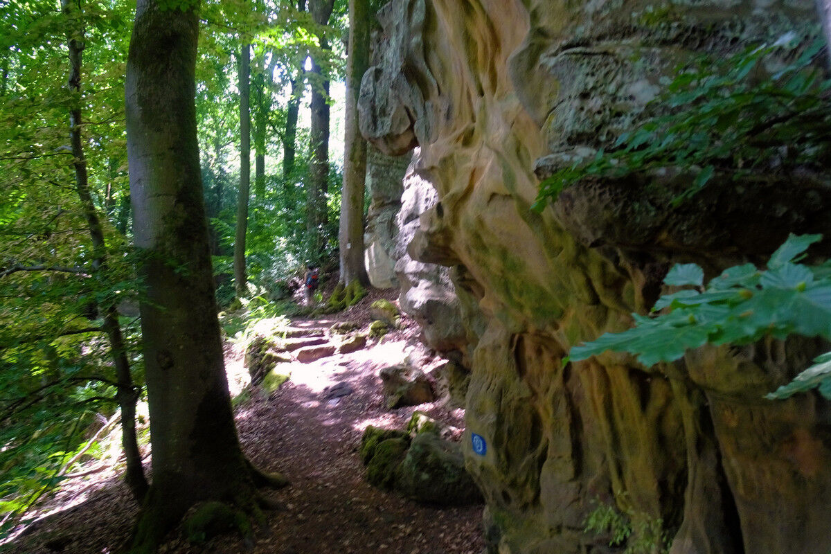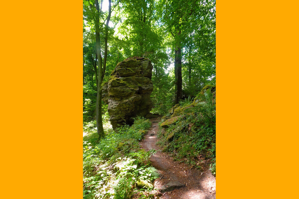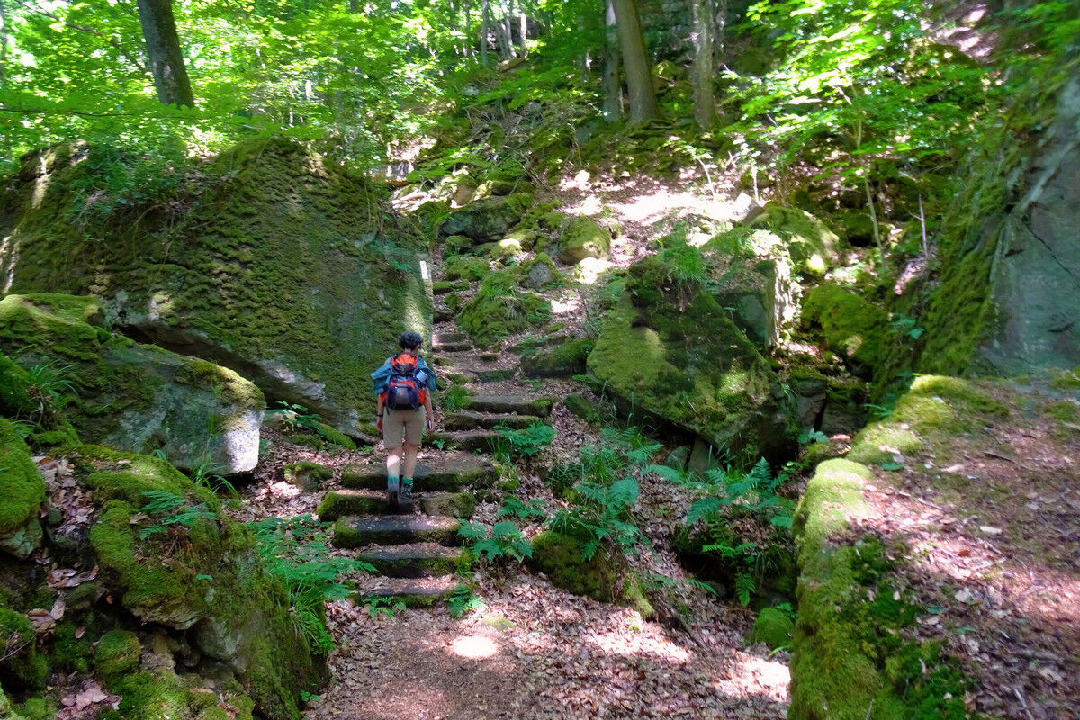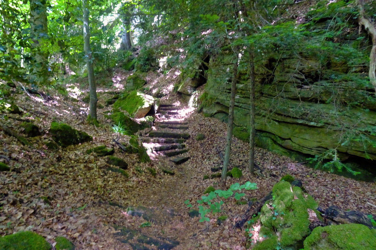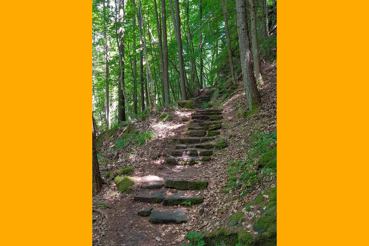 Fast höhengleich in ständigem Auf und Ab, über steinerne Treppen, auf schmalen Steigen und Pfaden verläuft der Wanderweg durch den Wald und wartet dabei ständig mit neuen Überraschungen auf.
