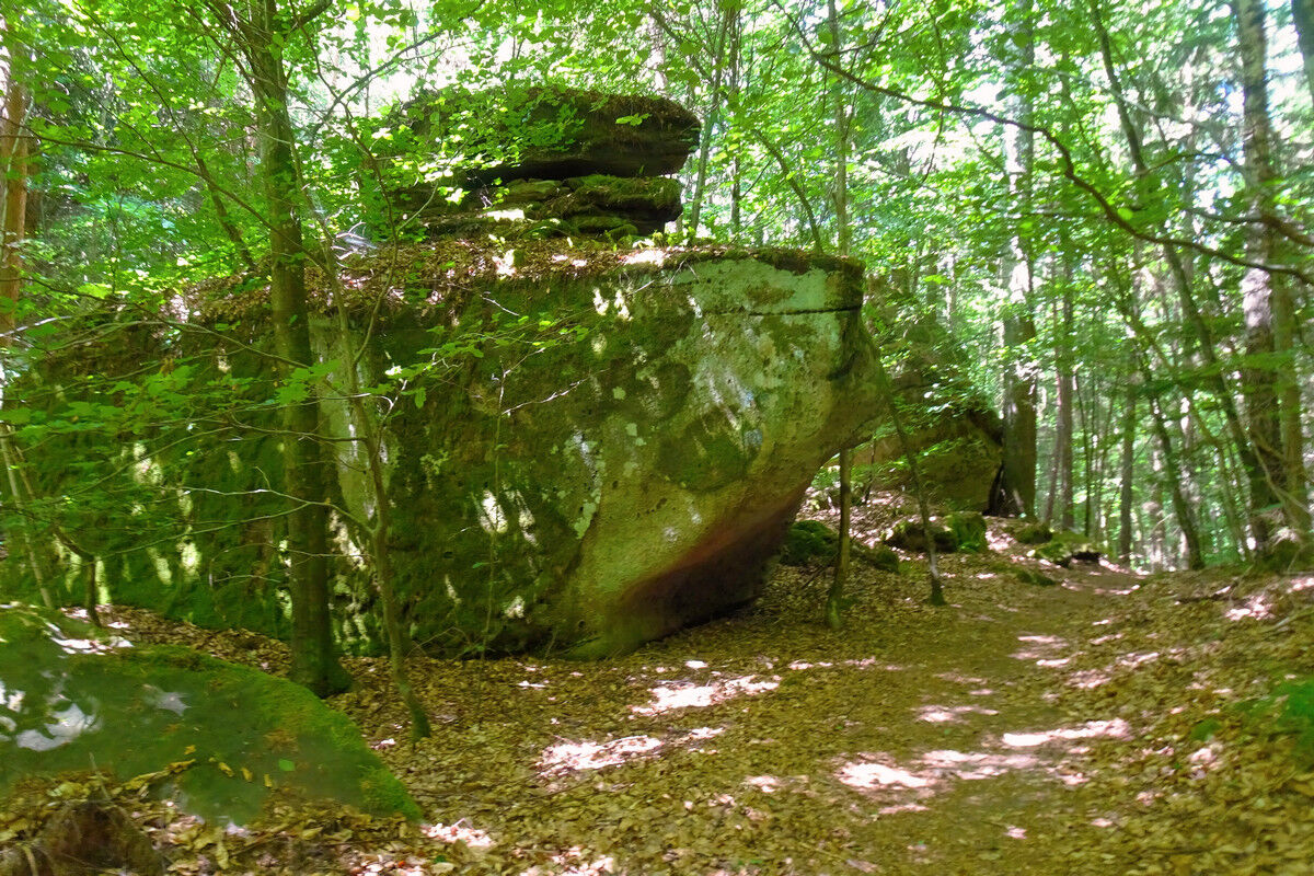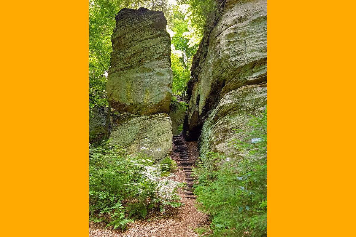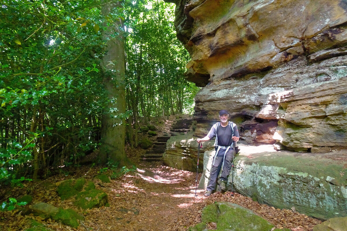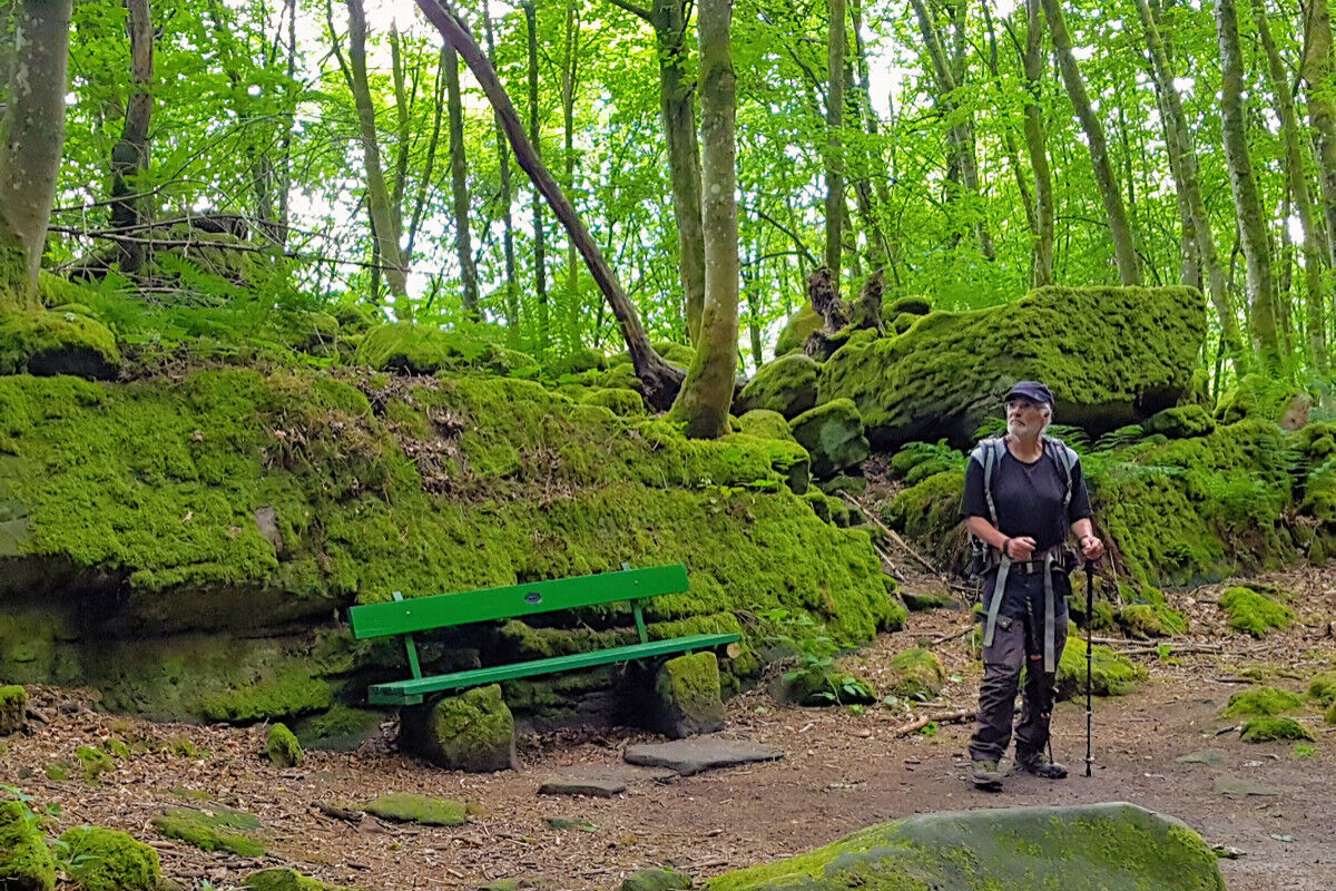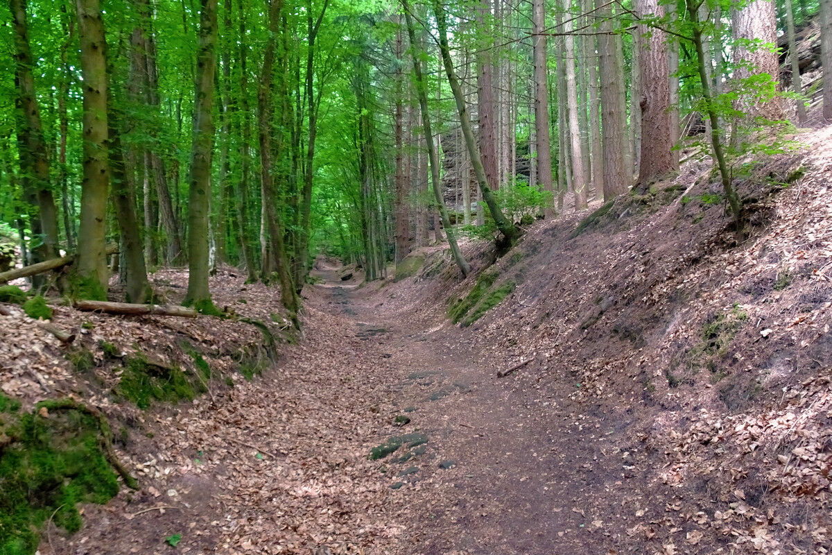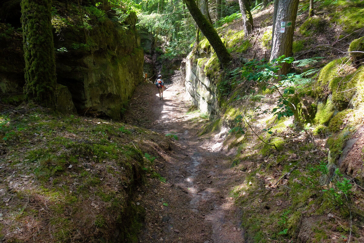 Fast höhengleich in ständigem Auf und Ab, über steinerne Treppen, auf schmalen Steigen und Pfaden verläuft der Wanderweg durch den Wald und wartet dabei ständig mit neuen Überraschungen auf.