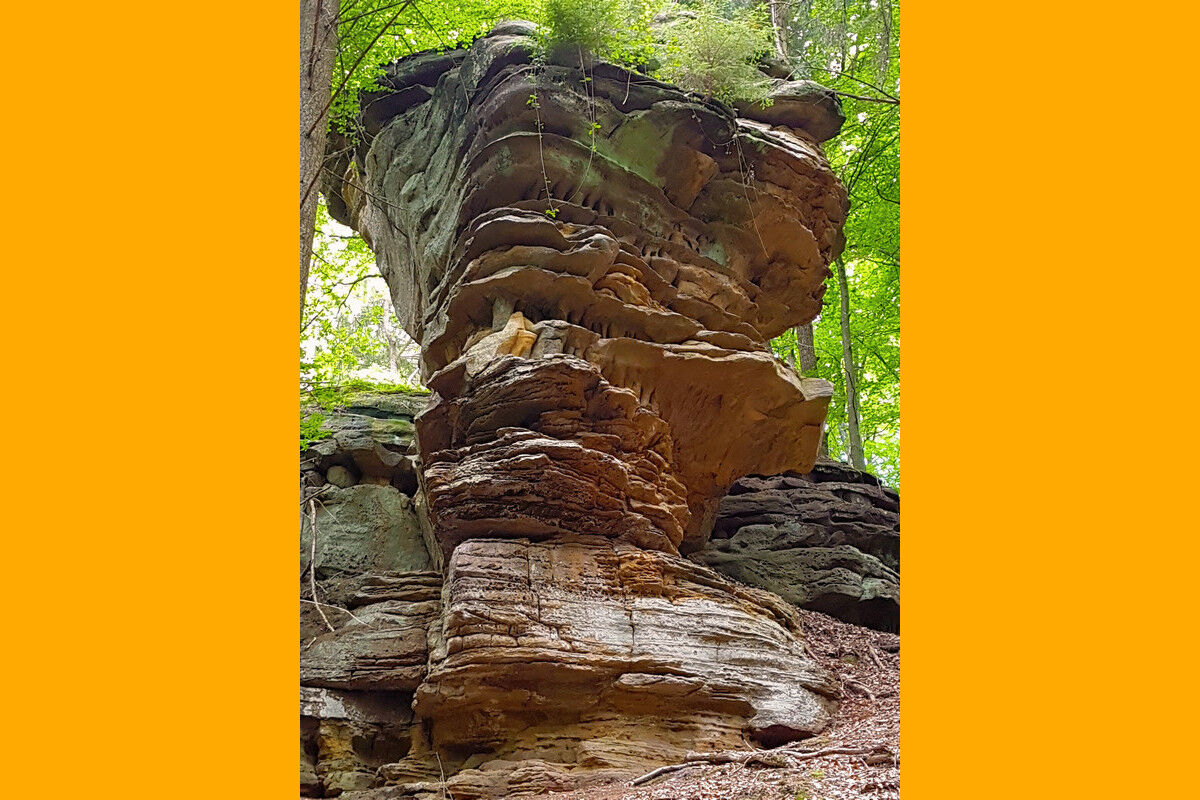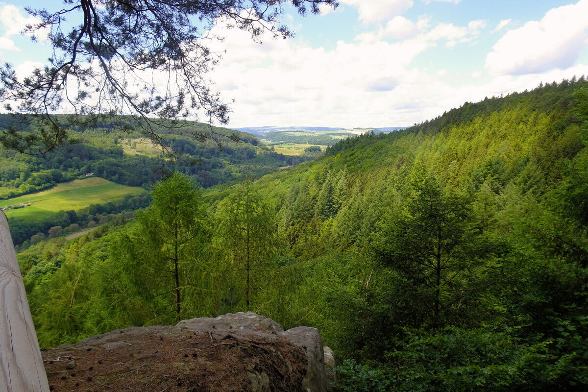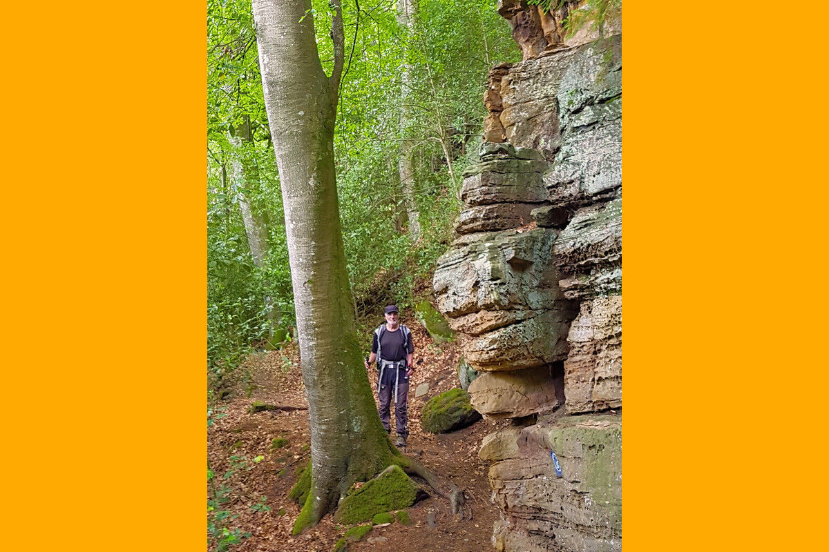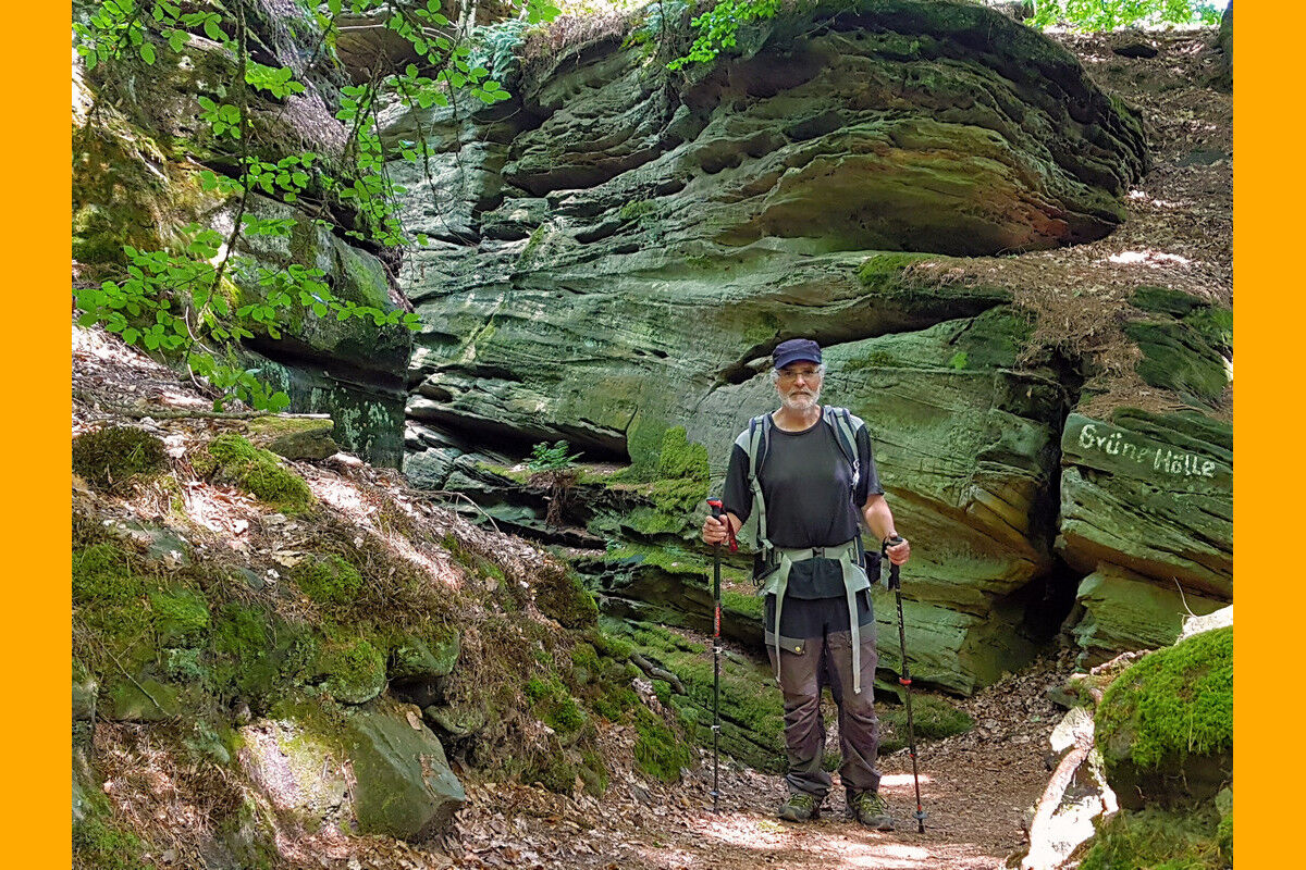 Oberhalb von Bollendorf am Wanderparkplatz beginnen wir mit unserer Tour durch die Grüne Hölle. Sogleich macht ein gigantischer, vollkommen isoliert stehender steil aufragender Buntsandsteinfelsen auf sich aufmerksam. Schon bald erreichen wir die Aussichtskanzel auf der Lingelslay. Der Panoramablick schweift tief hinab ins Sauertal und auf Bollendorf.