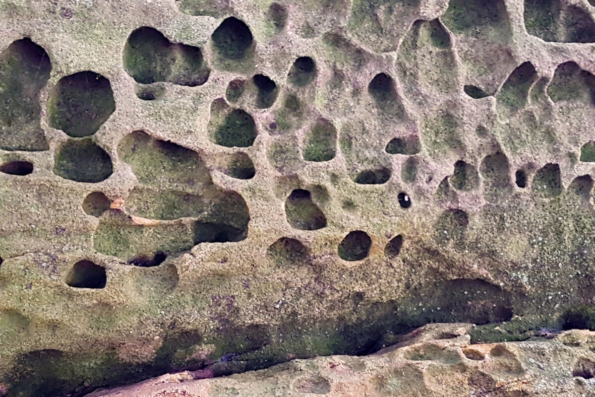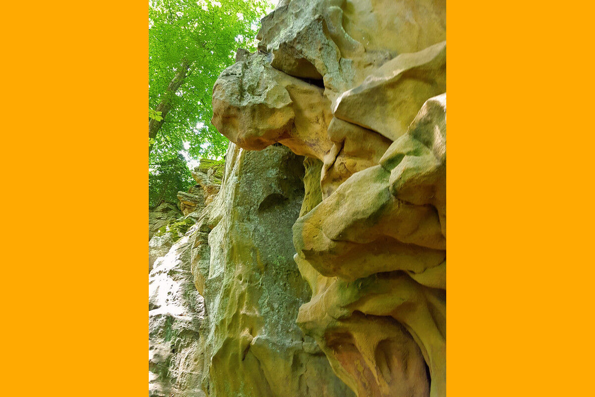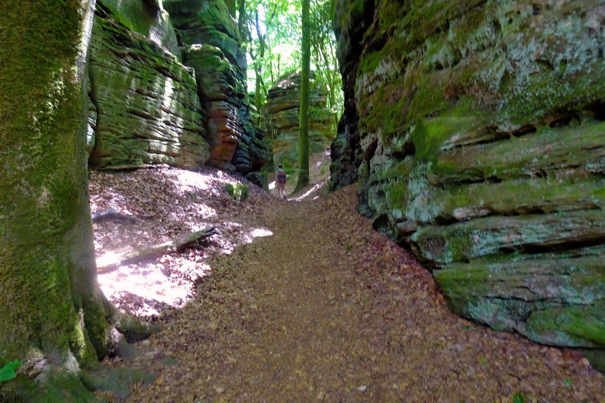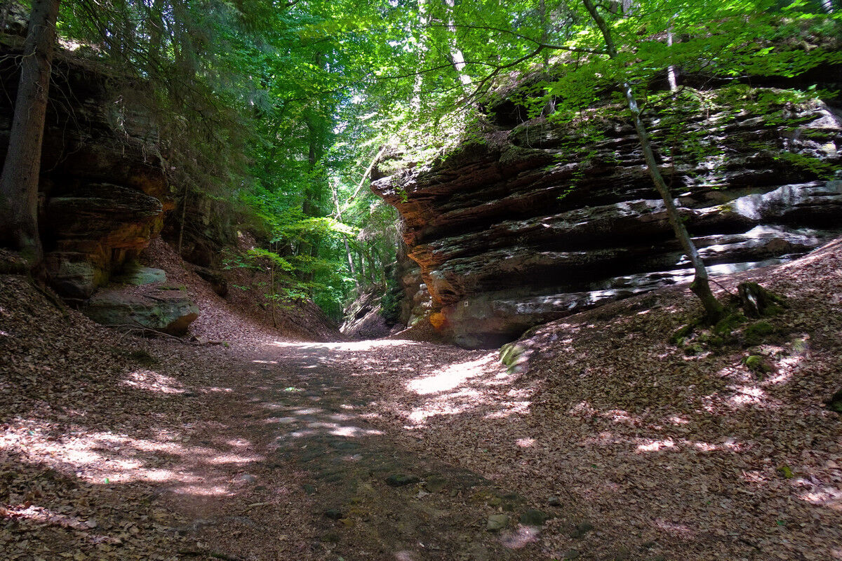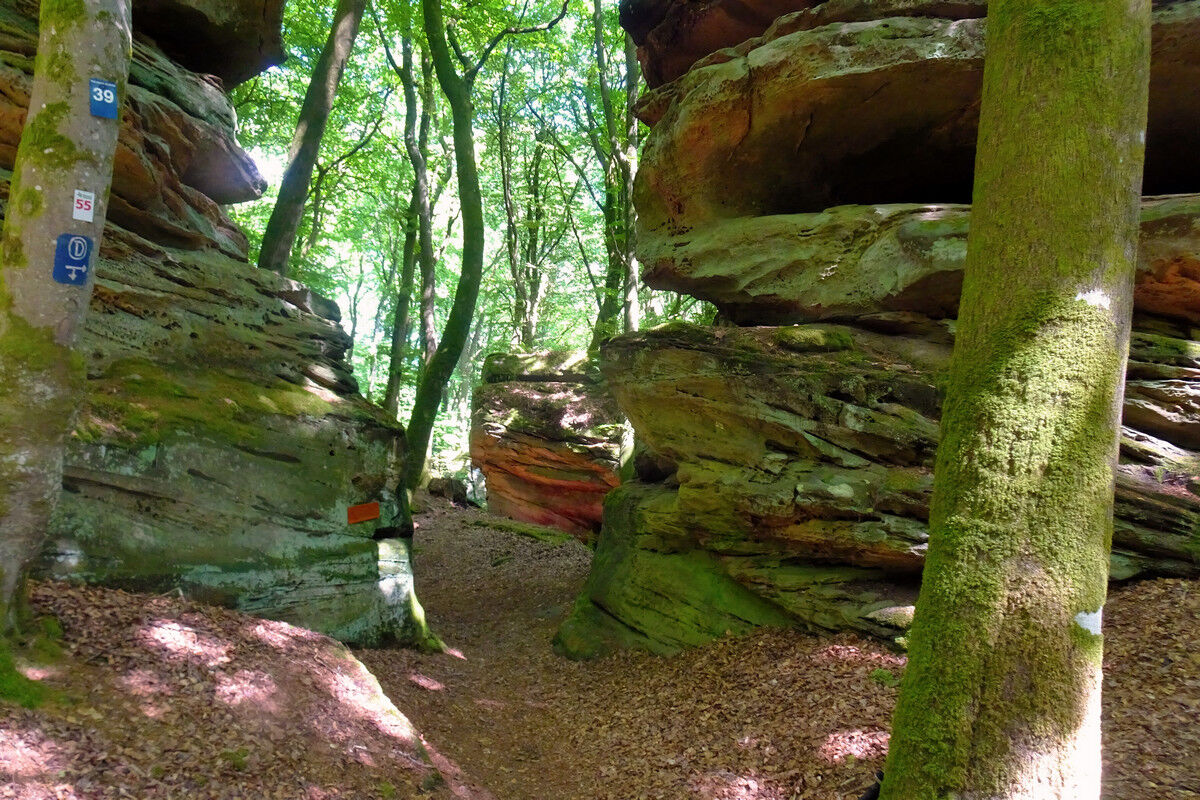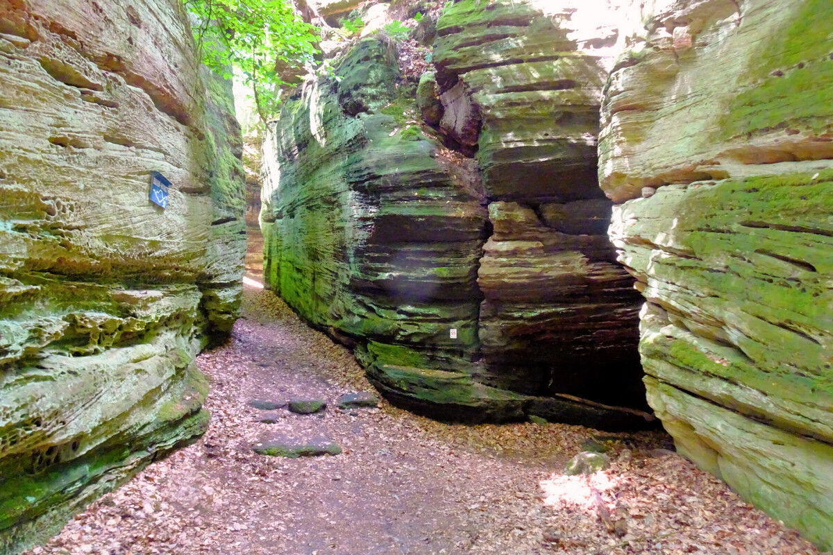 Leicht abfallend führt die Route sodann in die Felsen hinein, an lotrecht aufragenden Felswänden entlang. Gewaltige Buntsandsteinfelsen ragen links und recht des schmalen Pfades auf, während der sich windende Steig durch ein Gewirr unzähliger Gesteinsformationen führt. Tatsächlich drängt sich uns der Eindruck auf, dass der Teufel beim Zusammenfügen dieser gigantischen Felsblöcke seine Hand im Spiel gehabt haben könnte. Alles ist darüber hinaus noch mit sattgrünen Moosen und Flechten bewachsen.