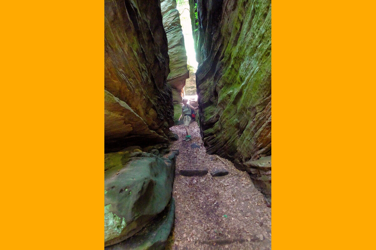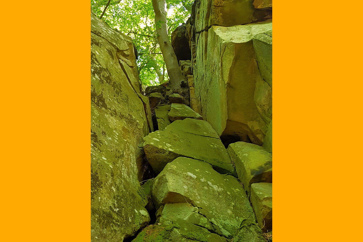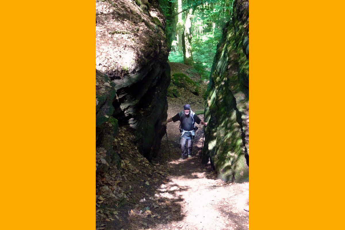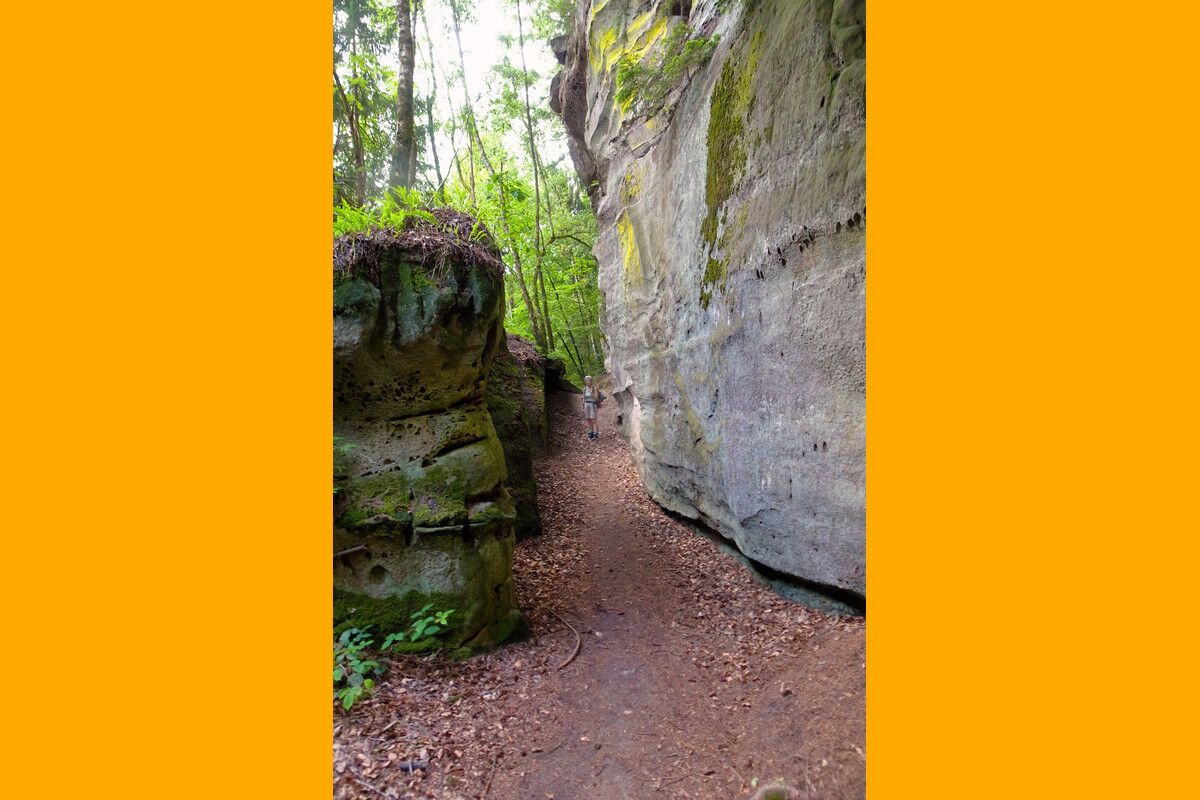 Damit nicht genug, die Routenführung setzt noch einen drauf. Im Bereich der Felsformation Eulenhorst wartet ein Felsenlabyrinth auf uns, in dem das Verirren vorprogrammiert zu sein scheint. Treppauf und treppab geht es durch die engen, klammartigen Felsschluchten. Rechts und links ragen glatte Felswände auf. Dunkle Schächte müssen wir durchschreiten, in schmale Felsenspalten zwängen wir uns förmlich hinein. Immer wieder müssen wir uns neu orientieren, um der richtigen Wegführung zu folgen.