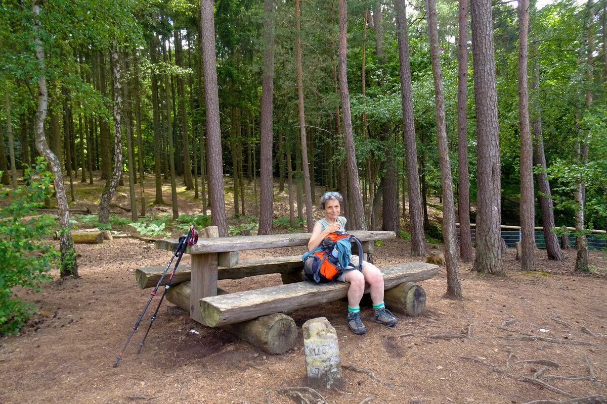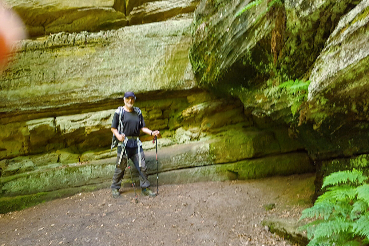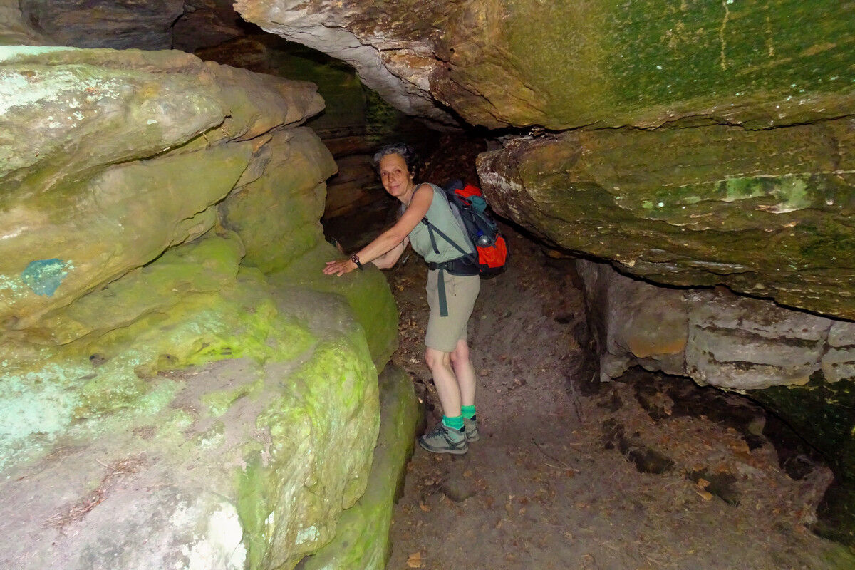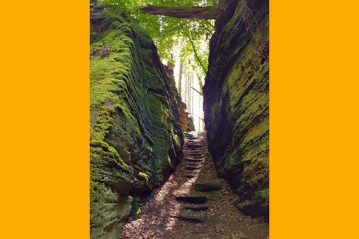 Schließlich erreiche wir den Eingang zu dem Felsmassiv, das dem Rundweg seinen Namen gibt. Um sicher zu gehen, wurde der Fels beschriftet: Grüne Hölle! Steinstufen führen tief hinab in einen schmalen Spalt mit hohen Wänden, der vor einem scheinbar undurchdringlichen hohen Felsen endet. Doch auf einer Seite des riesigen Felsens, der den Weg zu versperren scheint, öffnet sich ein niedriger Durchschlupf, und mehr kriechend als duckend schlüpfen wir hindurch. Wieder draußen empfängt uns Licht, Wald, riesige helle Sandsteinfelsen, Vogelgezwitscher und eine Bank. Erleichtert nehme wir Platz, um uns von der fordernden Wegstrecke zu erholen, und genießen eine kleine Pause.