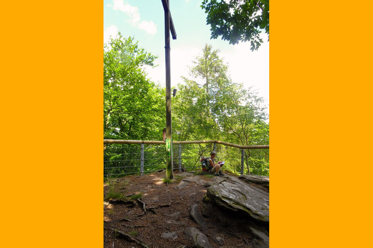 Vom historischen Grenzstein geht es durch ein idyllisches Tal mit Namen Moarkendell hinüber zum Aussichtspunkt Kreuzlay. Unter dem mächtigen Gipfelkreuz fällt unser Blick erneut ins Tal der Sauer.