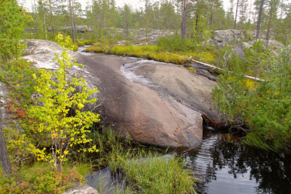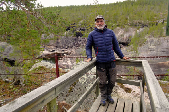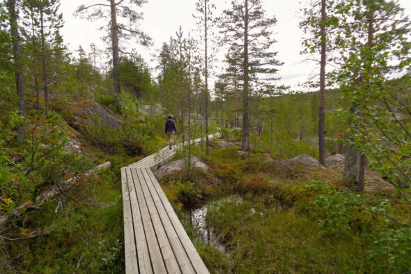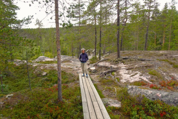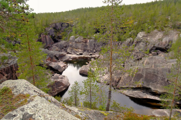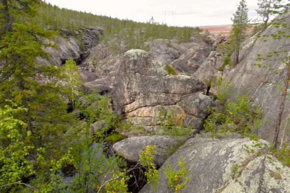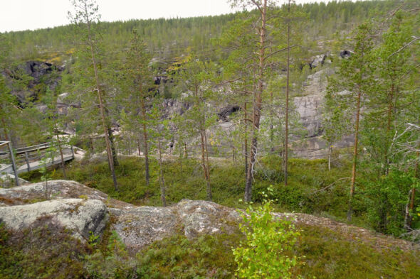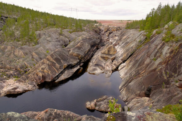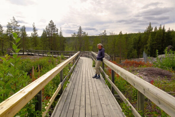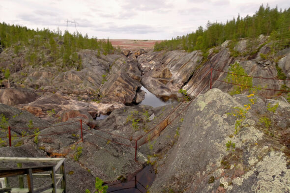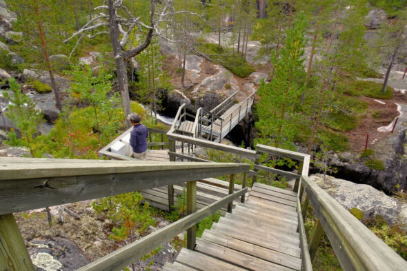 Vor dem Bau des Wasserkraftwerks Harsprånget südlich von Porjus war der Harsprångsfallet der größte Wasserfall am Stora Luleälven. Der Fluß hatte hier eine enge Schlucht in die Felsen gegraben und ist 75 Meter in die Tiefe gestürzt. Wasser sieht man heute jedoch nicht mehr, denn bereits 1950 wurde der Stora Luleälven zur Energiegewinnung gestaut. Auf einem aufwändig gebauten Holztreppenweg können wir in das wild zerklüftete Tal hinabsteigen. Von einer Aussichtsplattform bestaunen wir die bizzare, fast wasserfreie Schlucht und können uns gut vorstellen, wie der Stora Luleälven vor seiner Zähmung hier durchgedonnert ist.