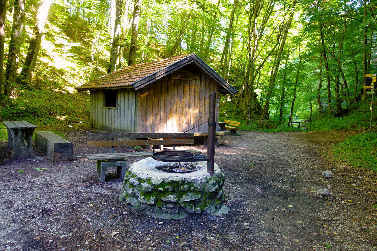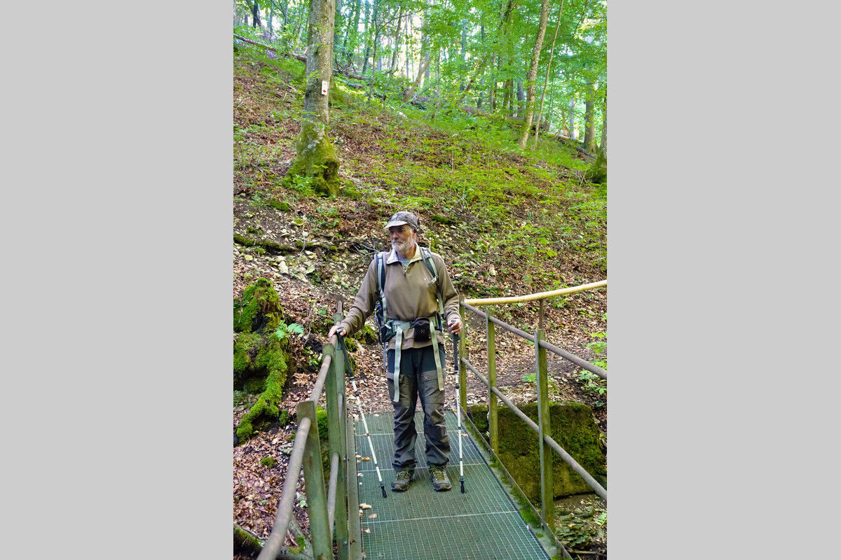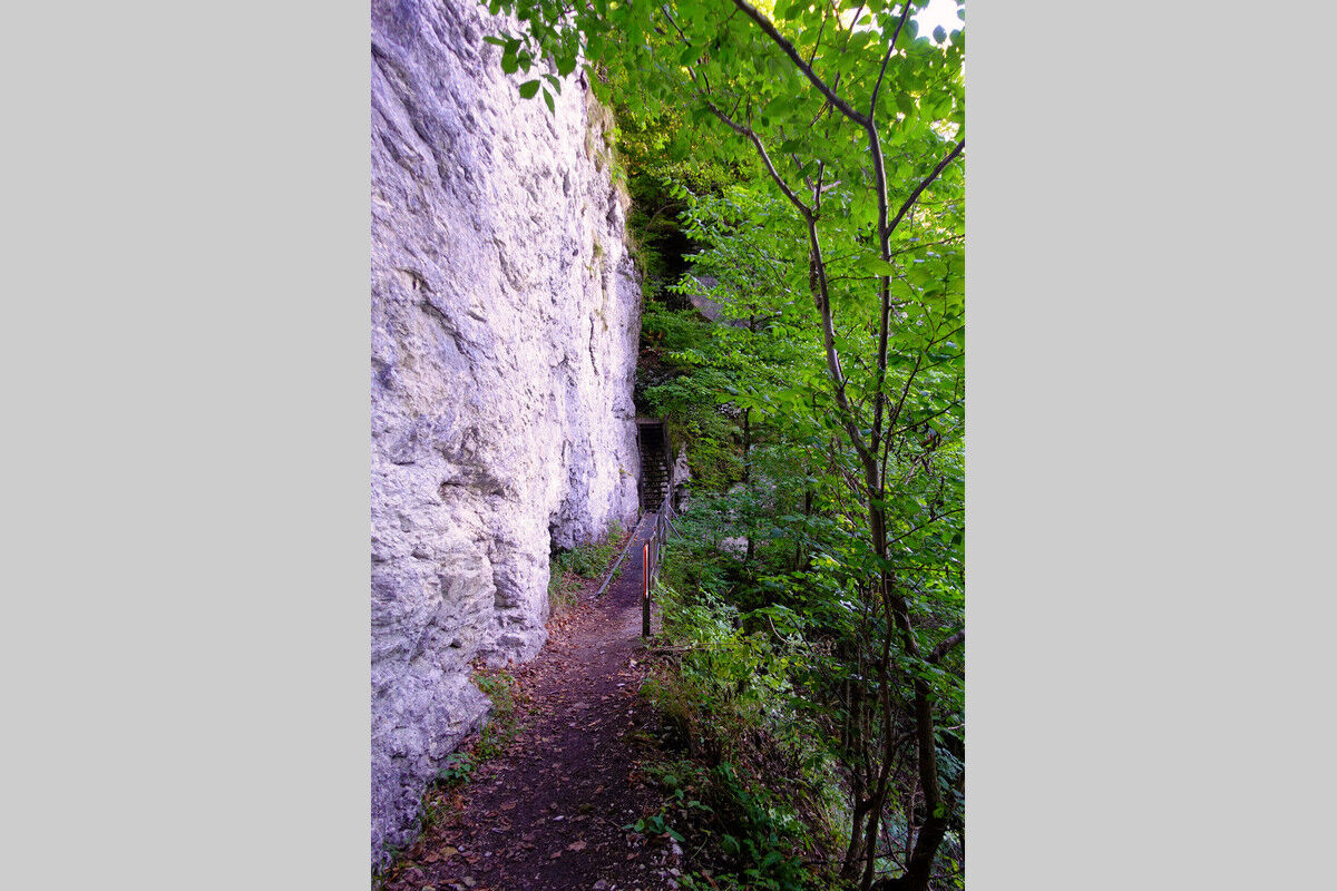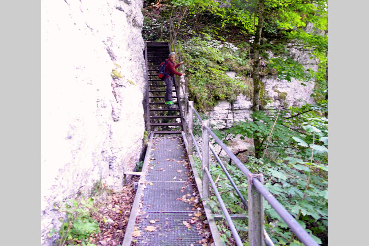 Steile Stufen führen uns nun hinab zur Versperhütte mit Grillplatz oberhalb der Hossinger Leiter. Die eisernen Brücken und Leitern der Hossinger Leiter, die sich an den kalten, weißgrauen Jurafels schmiegen, bringen uns zum staunen. Noch vor 100 Jahren war der Weg über die damals hölzernen Leitern der einzige Zugang vom Albdörfchen Hossingen zur Talgemeinde Lautlingen, der kürzeste Weg zur Zollernalbbahn und zum Arbeitsplatz.