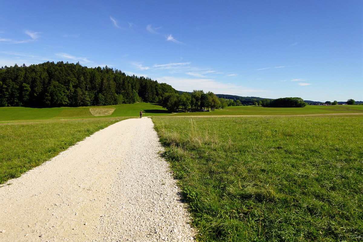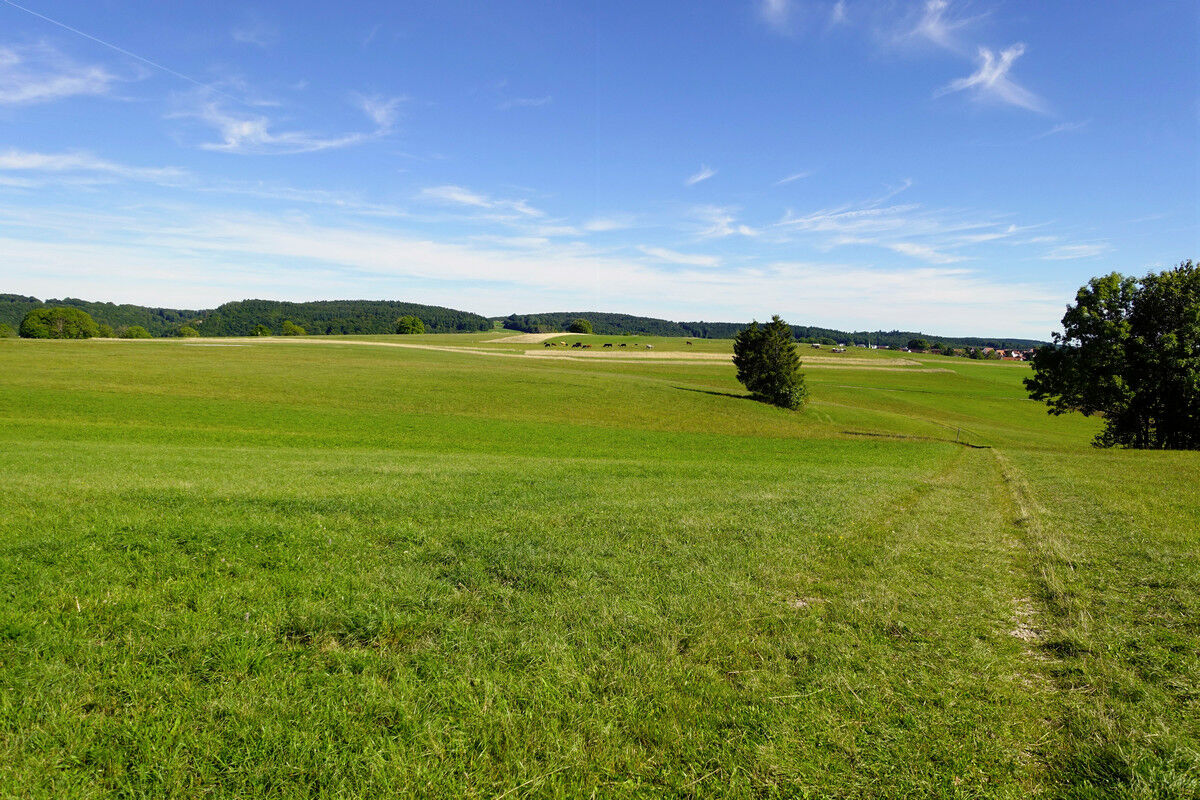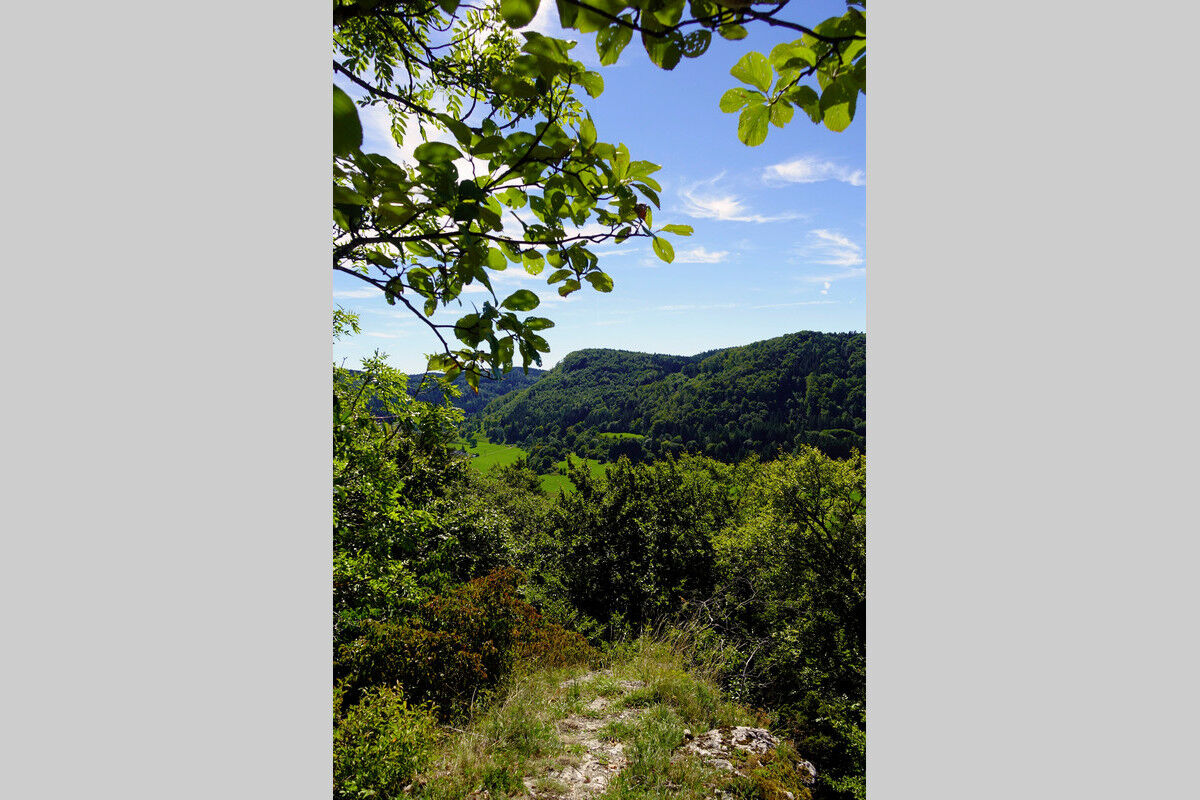 Wald und Waldrand geleiten uns zum Weiler Michelfeld, von Weiden und Pferdekoppeln umgeben, und weiter zum Spitzfelsen. Hier haben wir einen schönen Ausblick ins Bäratal und nach Tieringen.