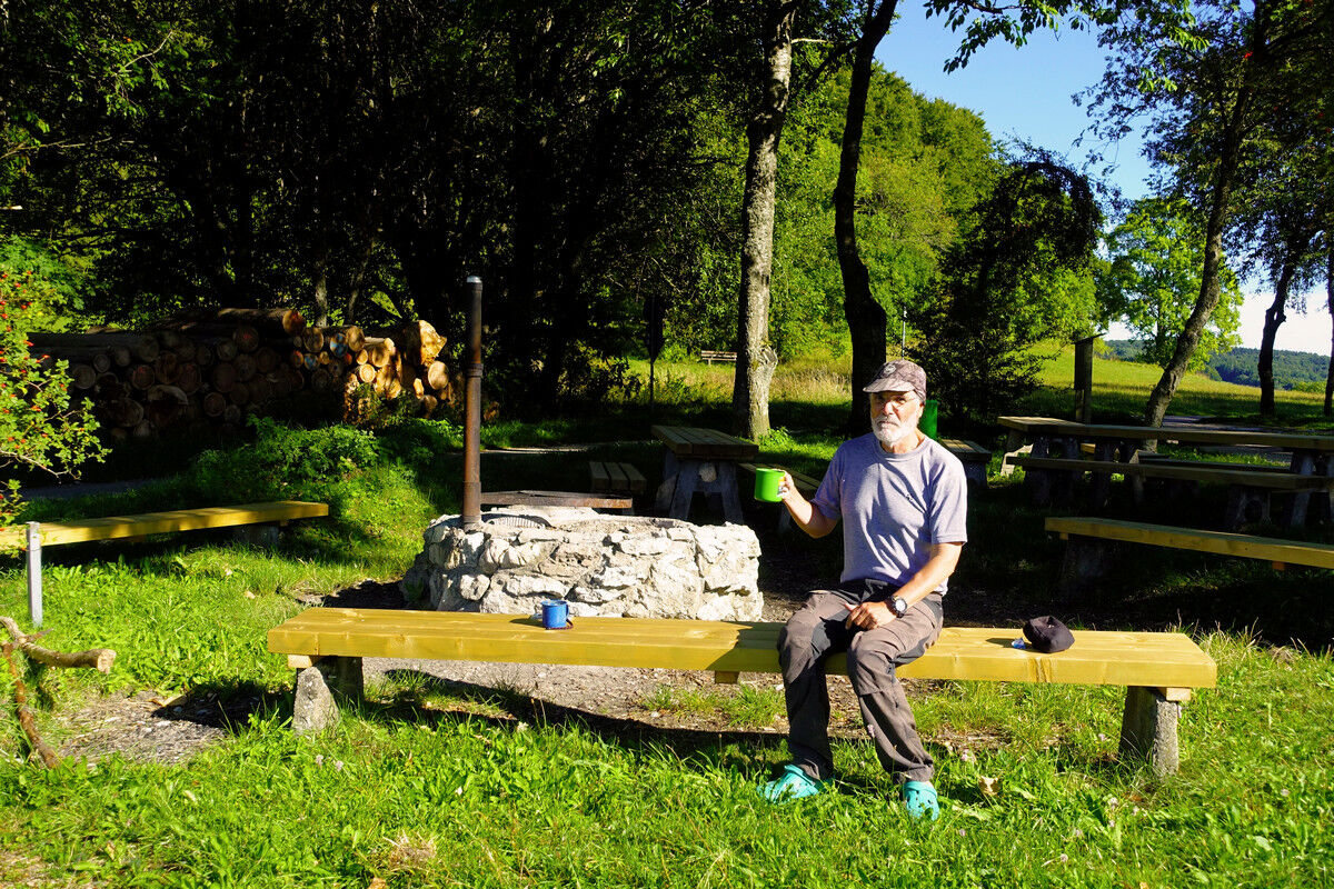 Durch Wald und über Felder wandern wir schließlich in aller Ruhe zurück zum Wanderparkplatz. Hier gibt es zum gemütlichen Abschluss unserer Zollern-Alb-Wandertage einen heißen selbst gekochten Kaffee.