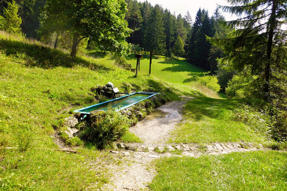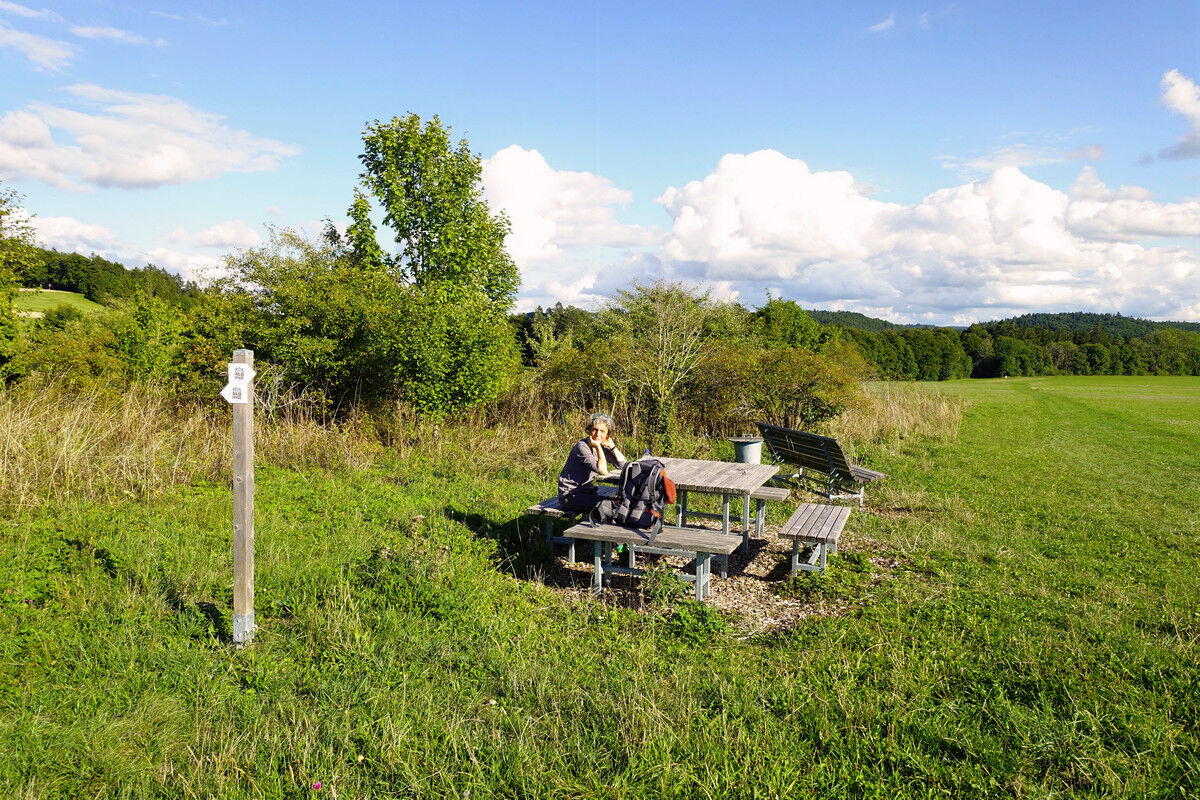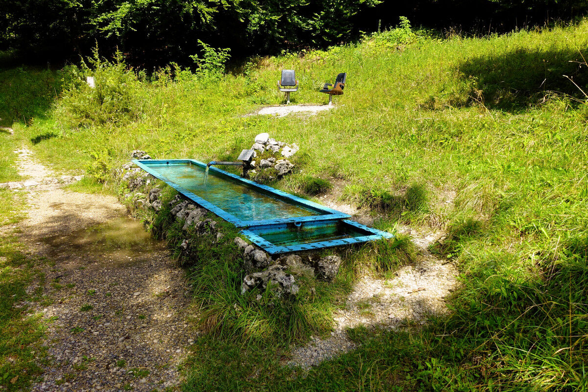 Schlichem nennt sich das kleine Bächlein, durch dessen Tal wir anfangs aufwärts wandern. Bis zu seiner Quelle auf einer Höhe von 880 m ist es nicht weit. Durch einen großen Hahn sprudelt das Wasser dort aus dem Berg in ein eigens angelegtes Becken, ein kühlender Zwischenstopp. Die Schlichem misst insgesamt rund 34 km und mündet bei Epfendorf in den Neckar.