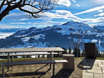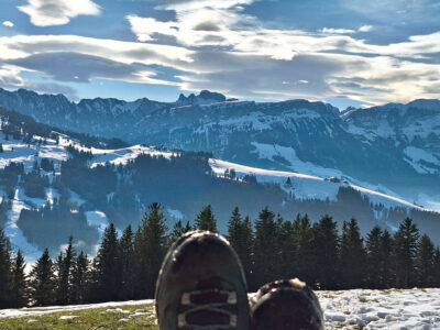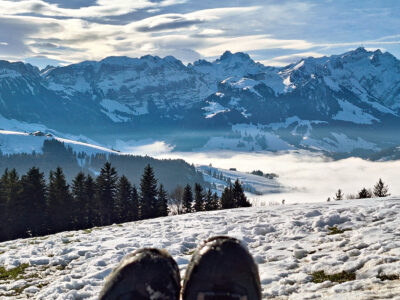 Vom Sammelplatz aus wandere ich durch die weiße Winterlandschaft, teils auf gespurtem Pfad, teils auf einem Forststräßchen bergauf. Bald erreiche ich das Berggasthaus Hoher Hirschberg. Hier ist viel los, viele sind mit dem Auto hochgefahren. Und es lohnt sich: Die Sonne scheint, der Ausblick ins Appenzellerland, auf den Alpstein und über das nebelbedeckte Rheintal bis nach Vorarlberg ist einfach traumhaft.