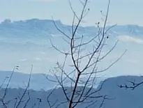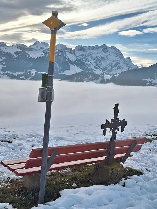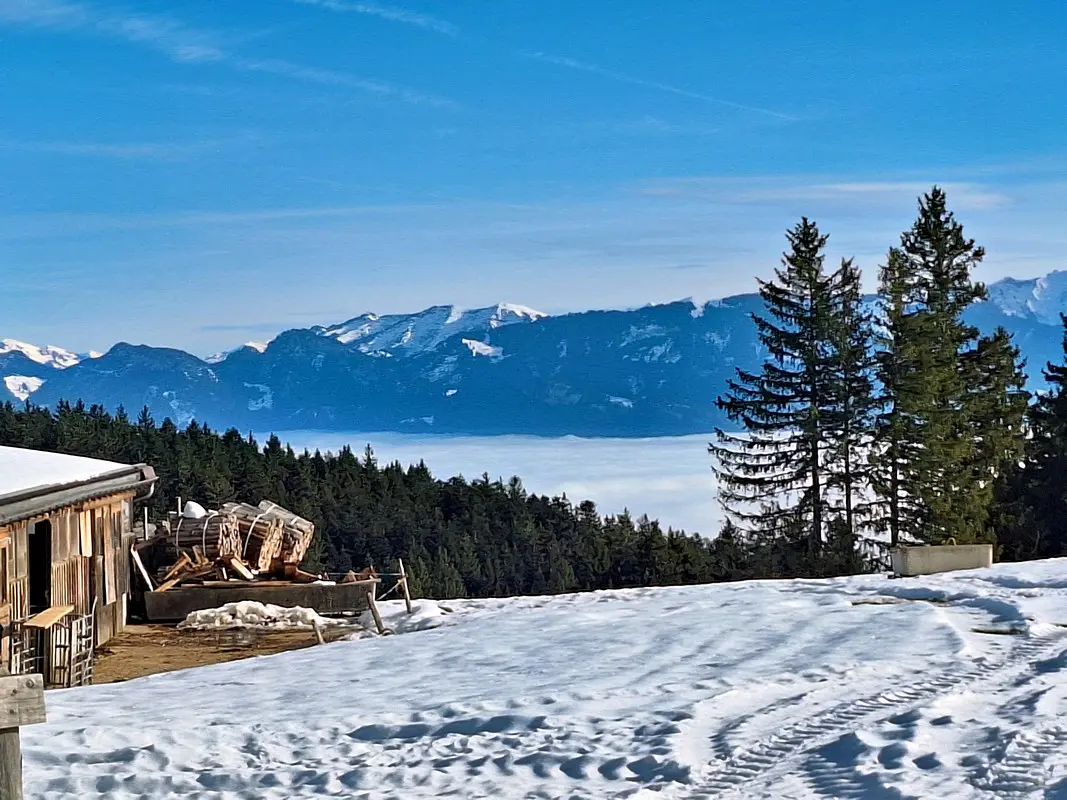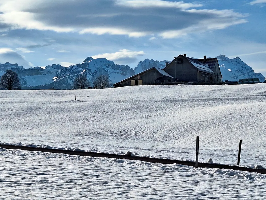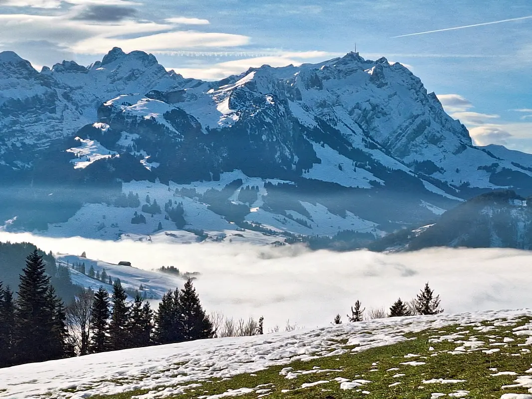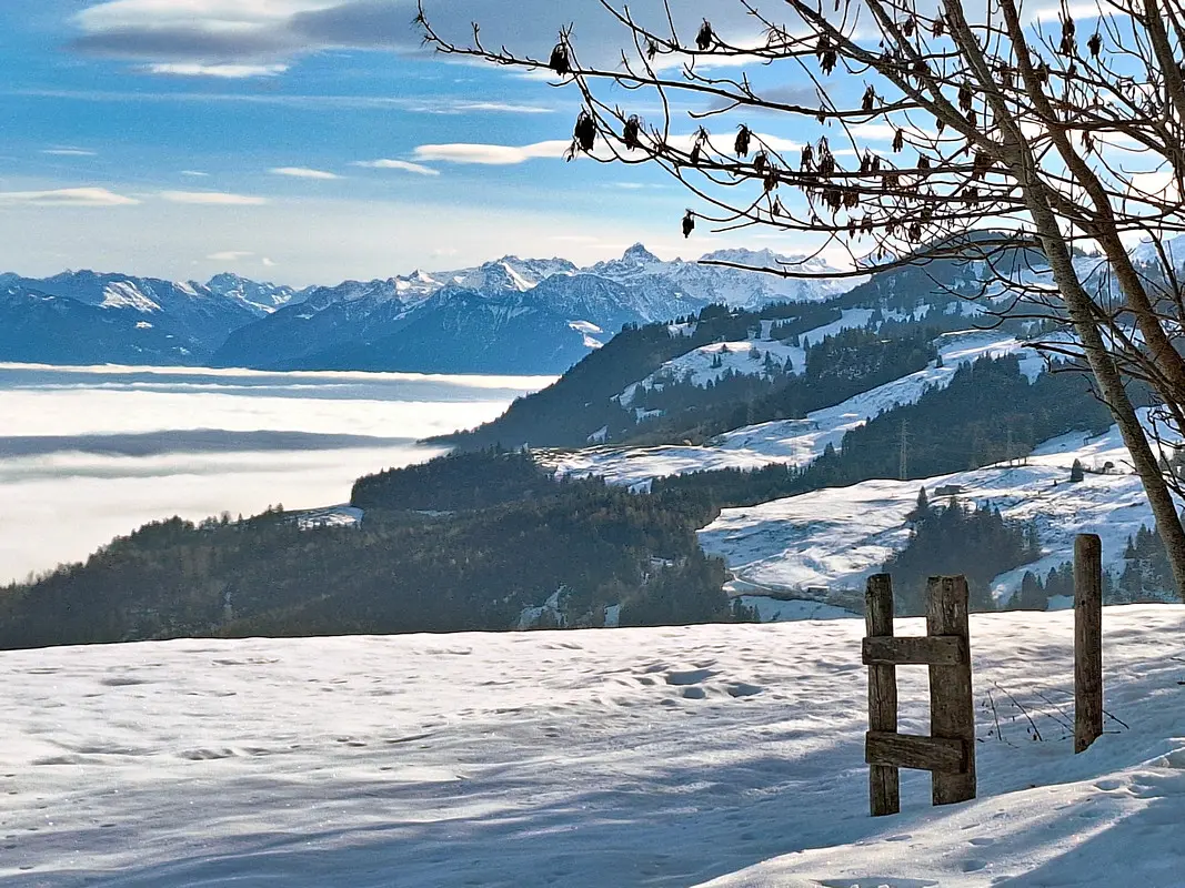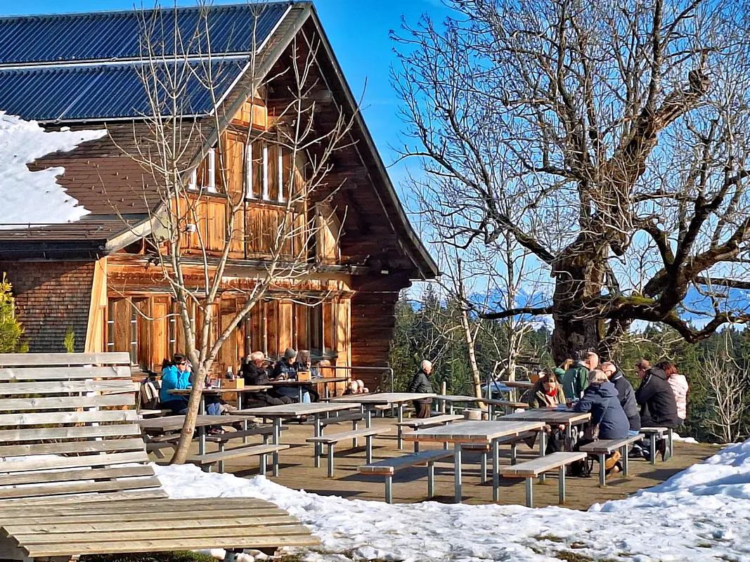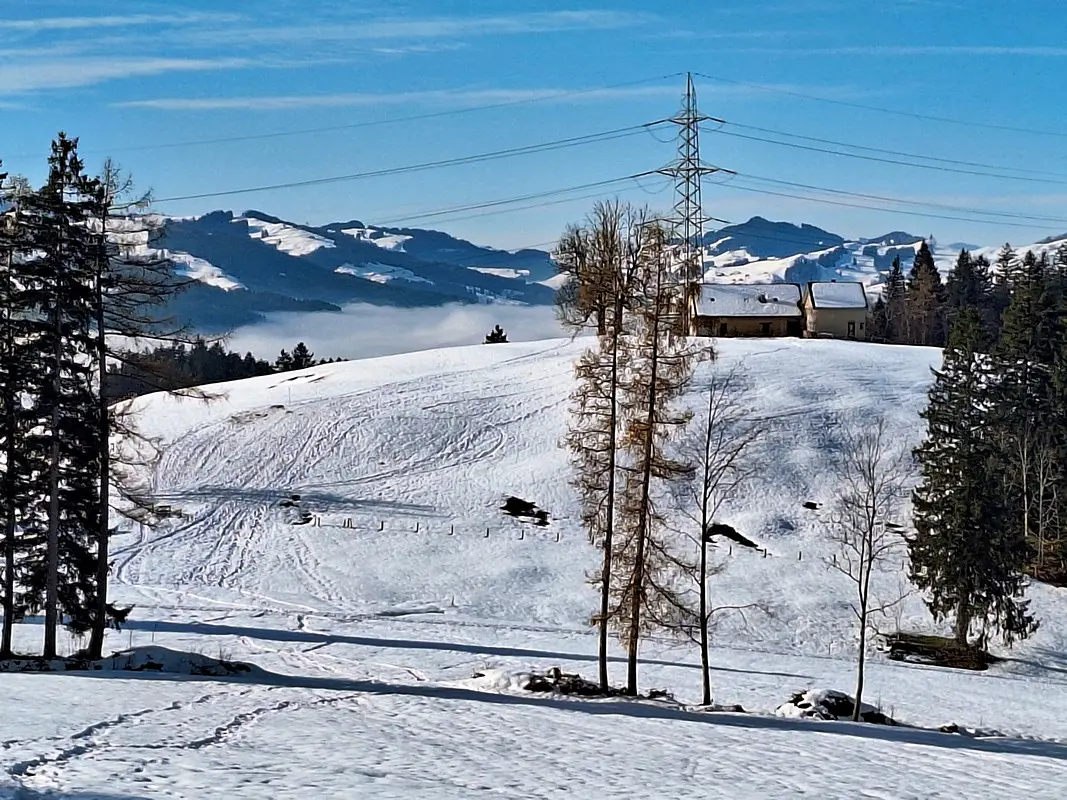 Vom Sammelplatz aus wandere ich durch die weiße Winterlandschaft, teils auf gespurtem Pfad, teils auf einem Forststräßchen bergauf. Bald erreiche ich das Berggasthaus Hoher Hirschberg. Hier ist viel los, viele sind mit dem Auto hochgefahren. Und es lohnt sich: Die Sonne scheint, der Ausblick ins Appenzellerland, auf den Alpstein und über das nebelbedeckte Rheintal bis nach Vorarlberg ist einfach traumhaft.
