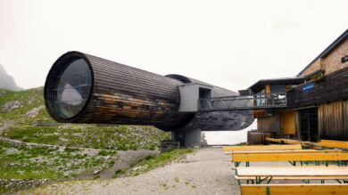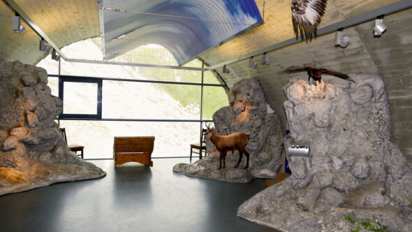 Zum Abschluss meines Karwendel-Abenteuers besuche ich noch das Fernrohr. Hier erwartet mich eine Ausstellung über Pflanzen, Tiere und Mensch im Hochgebirge ebenso wie der Schwindel erregende Blick in den Abgrund. In Form eines Fernrohrs gebaut ragt die »Bergwelt Karwendel« etwa sieben Meter über die Felskante ins Tal hinaus.