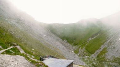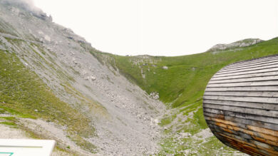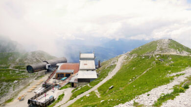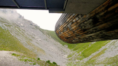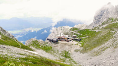 Mit der Karwendelbahn fahre ich in knapp 10 Minuten zur 2.244 Meter hoch gelegenen Bergstation, direkt an der Karwendelgrube. Auf der Fahrt kann ich einen der Aufstiegswege an der Felswand erkennen – sofort ist mir klar, warum er als „schwarz“ gekennzeichnet ist. Direkt an der Bergstation steht seit kurzem die große Röhre der Ausstellung „Bergwelt Karwendel“, die wie ein hölzernes Fernrohr aussieht.