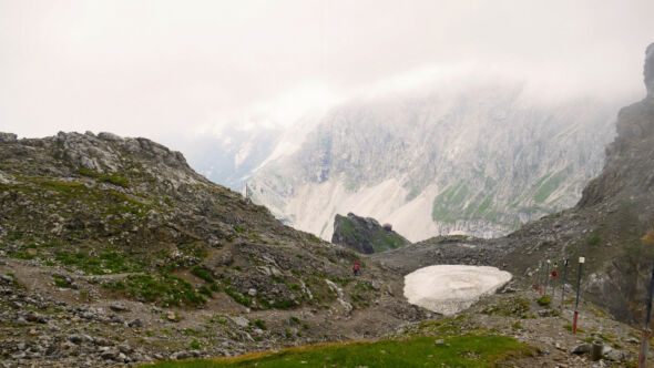 Die Karwendelgrube wird von der westlichen Karwendelspitze überragt, die über einen Klettersteig zu erreichen ist. Ich bleibe aber auf dem Panorama-Rundweg, der um die Karwendelgrube führt, teilweise ist er als Passamani-Rundweg gekennzeichnet.