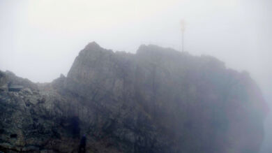 Doch es kam wie es kommen musste: die Zugspitze empfängt mich am Gipfel mit Nebel, Schneeregen und kühlem Wind, der Gipfel ist kaum zu sehen, von einem Panoramablick über vier Länder ganz zu schweigen.