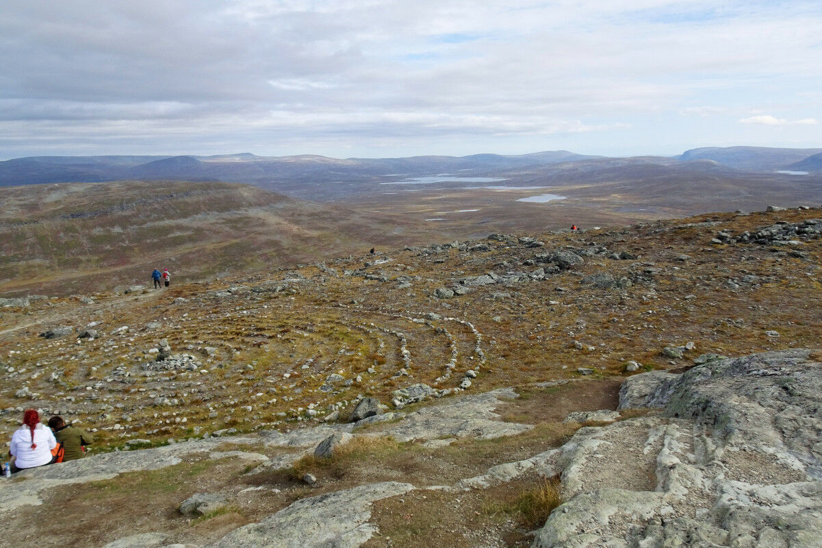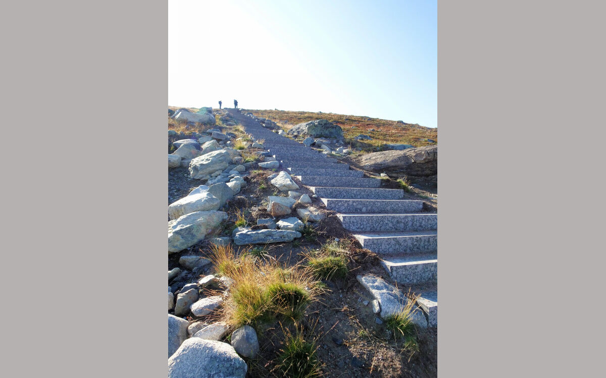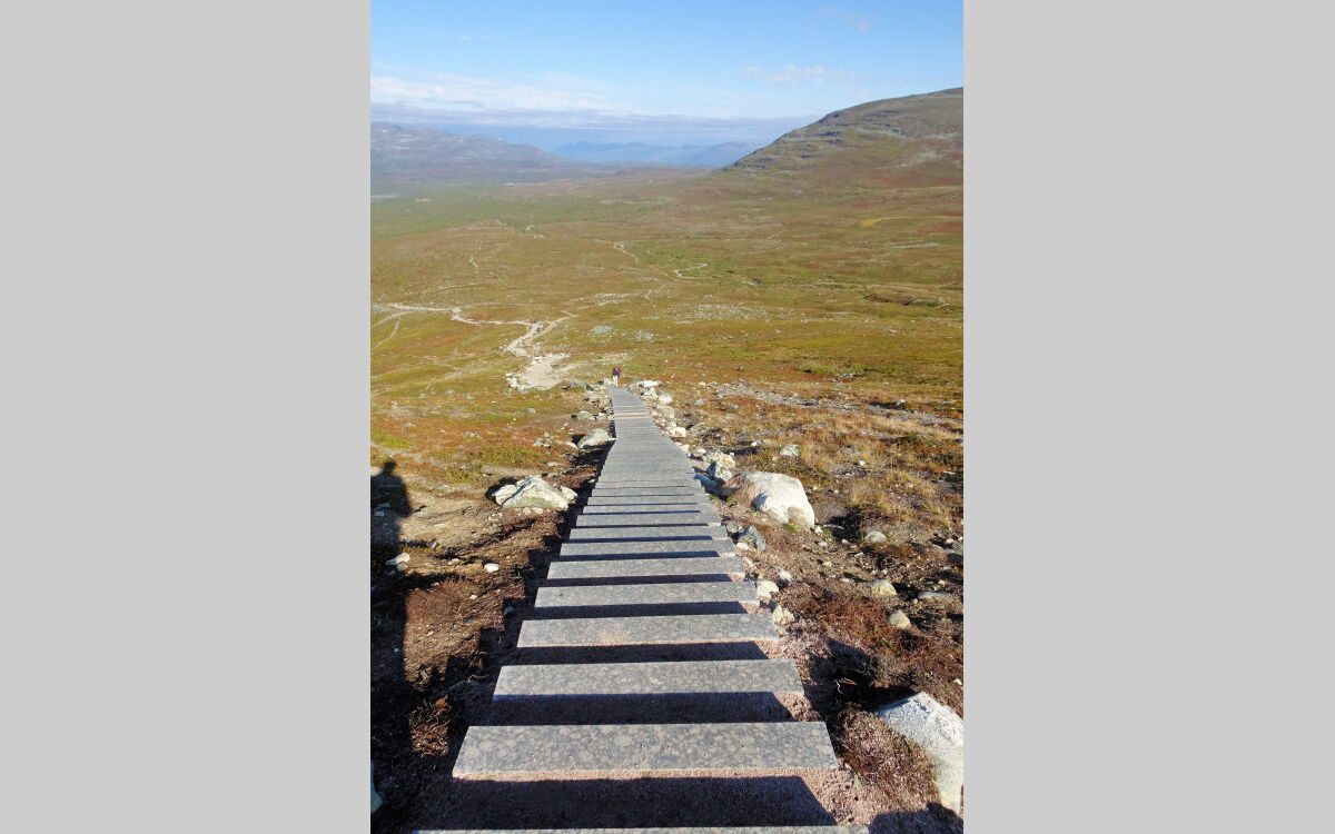 Hier begann bis 2018 die angeblich längste Treppe Finnlands: etwa 150 Höhenmeter mussten auf unzähligen Stufen einer steilen Holztreppe überwunden werden. Um die fragile Vegetation besser zu schützen, wurde ein neuer Weg mit einer kürzeren Steintreppe angelegt. Auch diese Treppe ist steil, wir geraten tüchtig ins Schwitzen. Ein immer mehr fantastischer werdendem Blick auf den Kilpisjärvi und die Gebirgslandschaft belohnt die Mühen.