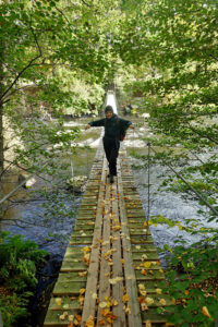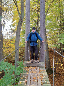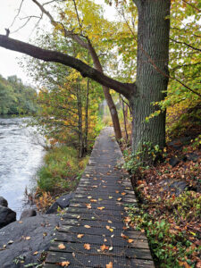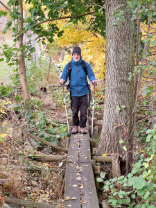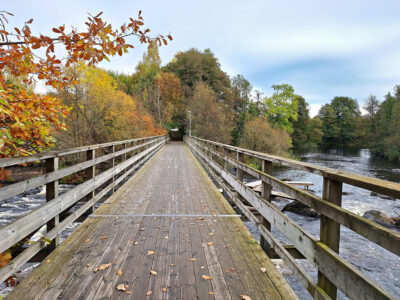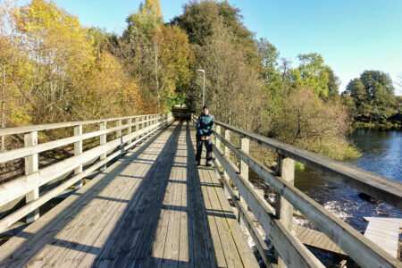 Beim Start in Mörrum ist es noch kalt. Die Runde am Mörrumsån ist nicht besonders lang und verläuft größtenteils direkt am Fluss entlang, mal auf schmalen Pfaden, mal auf Holzstegen. Bei der Hängebrücke erwartet uns ein großer Rastplatz direkt am Fluss, und wohlverdient zeigt sich hier endlich auch das schöne Wetter.