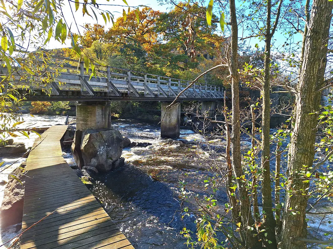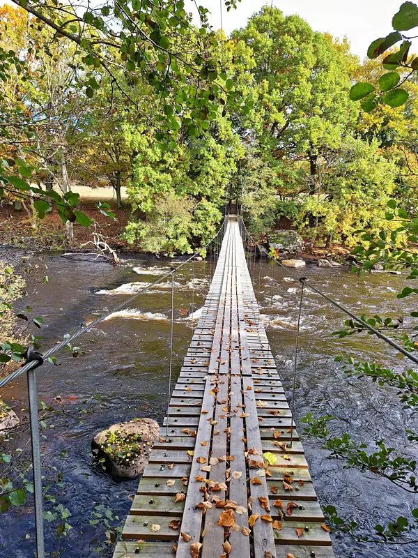 Beim Start in Mörrum ist es noch kalt. Die Runde am Mörrumsån ist nicht besonders lang und verläuft größtenteils direkt am Fluss entlang, mal auf schmalen Pfaden, mal auf Holzstegen. Bei der Hängebrücke erwartet uns ein großer Rastplatz direkt am Fluss, und wohlverdient zeigt sich hier endlich auch das schöne Wetter.