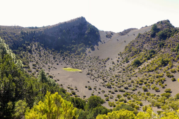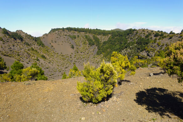 Die Caldera de la Hoya de Fireba hat einen Durchmesser von etwa 260 Metern und ist 110 Meter tief. Die Informationstafel am Kraterrand verrät uns zu unserer Überraschung, dass der hellgrüne Fleck am Boden des Kraters von den Überresten des Kartoffelanbaus früherer Jahre zeugt. Dieser Explosionskrater ist der am besten erhaltene der Insel und sieht im warmen Nachmittagslicht mit der Vegetation und der Lava einfach umwerfend schön aus.