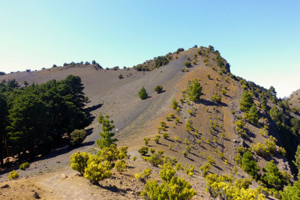 Links blicken wir über eine weniger steile Zone zur Punta de la Dehesa. Dieses Gebiet wurde vom Vulkan Tanganasoga mit jüngerer Lava aufgefüllt.