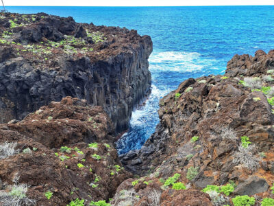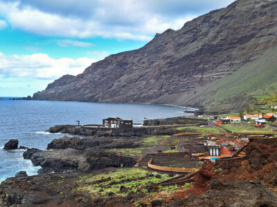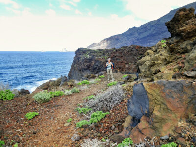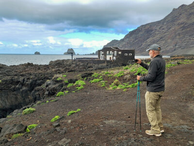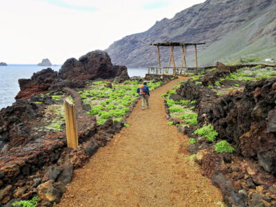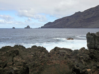 Der Wanderweg zwischen dem Meeresschwimmbecken La Maceta im Süden und dem kleinen Ort Las Puntas im Norden wurde im Jahr 2010 komplett neu angelegt. So wandern wir auf dieser Küstentour bequem über Holzstege durch die Lavafelsen und können zwischendurch auf schön angelegten Rastplätzen pausieren. Immer wieder öffnen sich herrliche Blicke auf Klippen und Felsbuchten, auf Felstore und natürlich über das weite Golftal. Unser Ziel ist das auf einer Lavazunge stehende, von hohen Wellen umspülte Hotel Punta Grande, einst das kleinste Hotel der Welt.