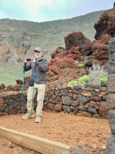 Nach diesem Abstecher gehen wir zurück auf den Holzplankenweg. Er verläuft zunächst direkt am Meeresspalt entlang und führt anschließend an einer Felsbucht mit eindrucksvollen Basaltsäulen vorbei. Wir erreichen den Mirador Punta Izquierdo, danach den Mirador Las Puntas und kurz darauf bei einem Felskopf den Mirador Playa del Río, von dem wir einen schönen Blick nach Punta Grande haben.