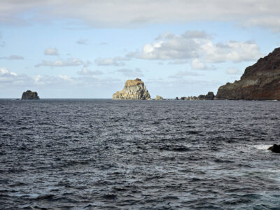 In La Maceta folgen wir dem Küstenweg PR EH 8.1 in östlicher Richtung. Etwa zwei Minuten nach dem Kiosk zweigt der Holzplankenweg vom Fahrweg ab und führt kurz darauf zum Mirador Punta del Pozo. Von hier blicken wir hinüber zum vorgelagerten Roque del Pozo und zurück nach La Maceta.