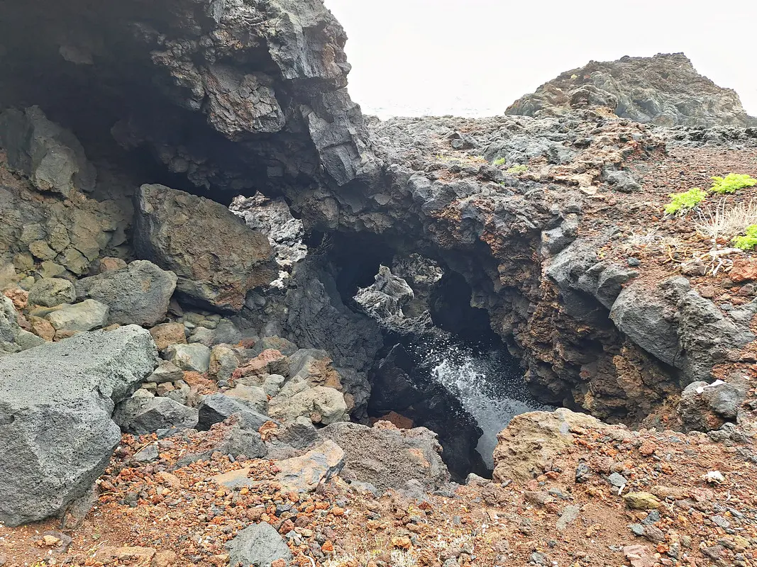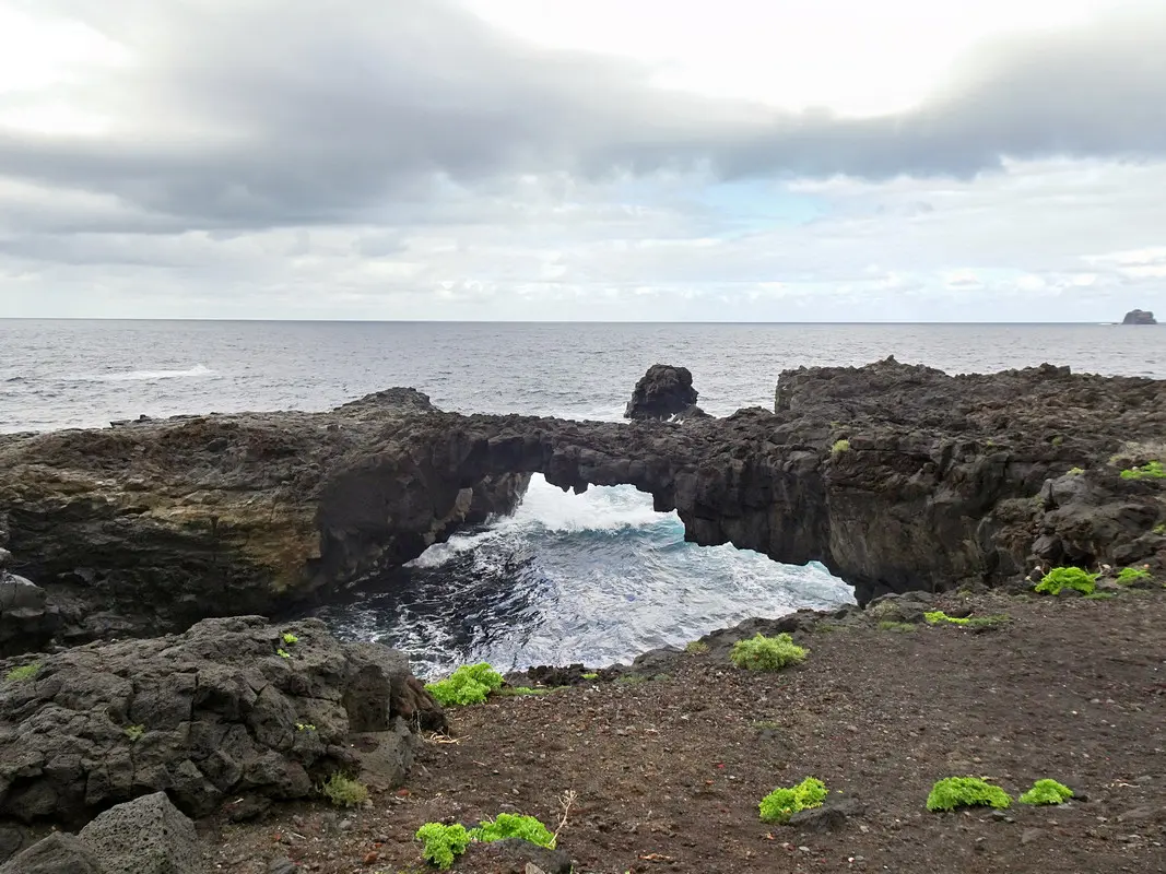 Nun steigen wir über Stufen hinab zum Meeresschwimmbad Cascadas del Mar. Wir gehen links am Bad vorbei und kommen gleich danach am kleinen Meerespool von El Río vorbei. Ein Fahrweg führt uns schließlich hinüber zum nahen Hotel Punta Grande. Unterwegs können wir noch ein weiteres Felstor bewundern. Der nahezu perfekte Torbogen spannt sich über mindestens zehn Meter.