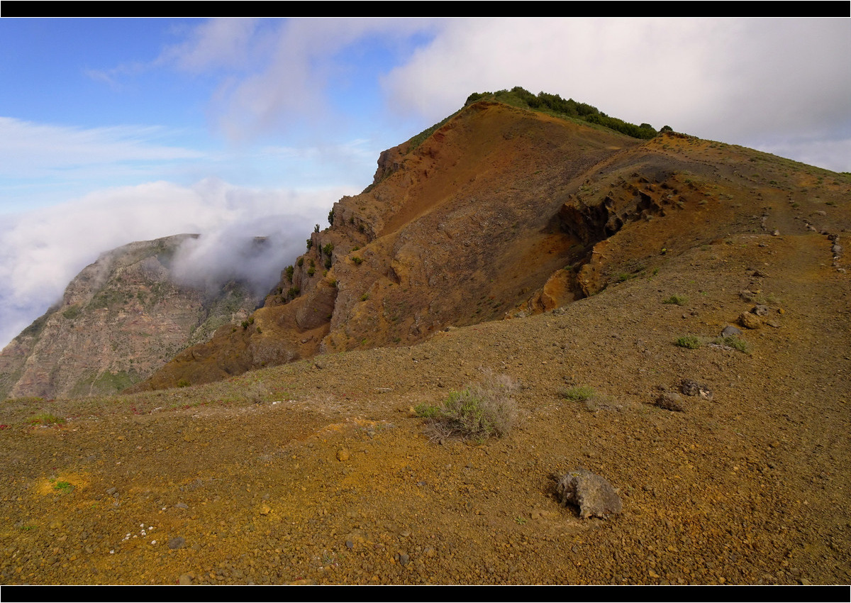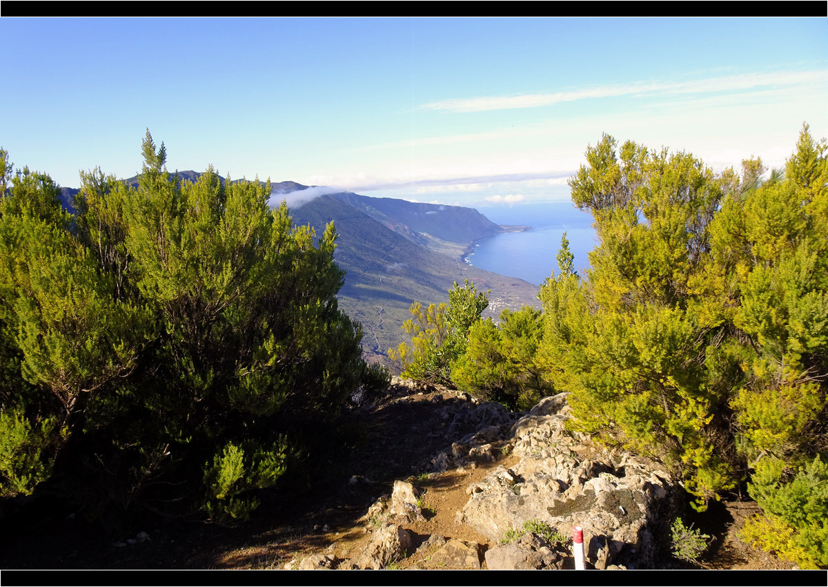 Der schmale Pfad vom Mirador de la Hoya de Fireba entlang der Kammkante über dem gut 1.300 Metern tiefer gelegenen El-Golfo-Tal zum Mirador de Jinama ist wenig bekannt. Aber der Weg lohnt sich, vor allem bei schönem, wolkenlosem Wetter. Diese Wanderung gehört sicherlich zu den schönsten und aussichtsreichsten Touren auf El Hierro. Und dazu besteigen wir noch den siebthöchsten Berg von El Hierro, den 1.350 m hohen Jinama.