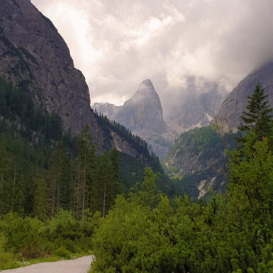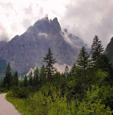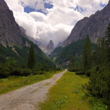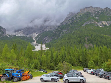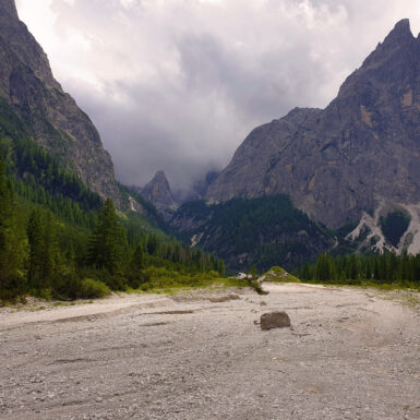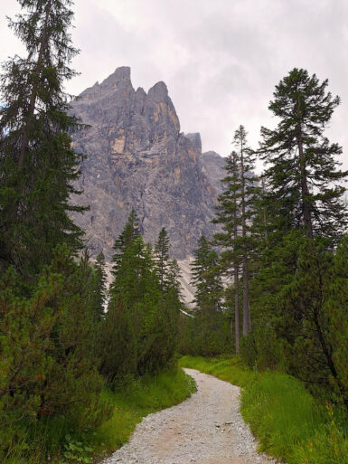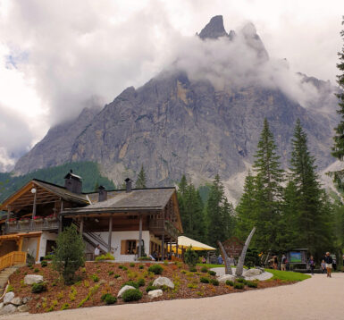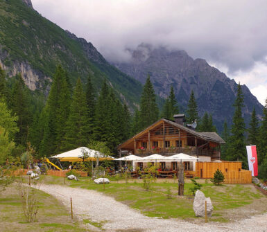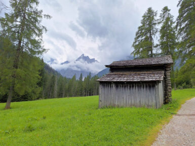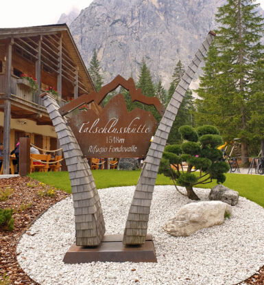Von dort führt ein breiter Schotterweg noch etwa zwei Kilometer weiter bis zur Talschlusshütte – am Fuße der Sextner Sonnenuhr, der Dreischusterspitze und der markanten Kalktürme der Rotwand.