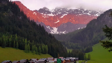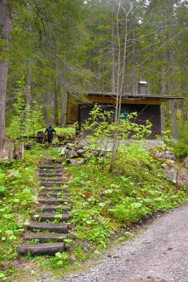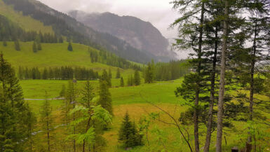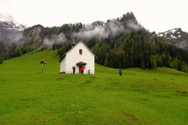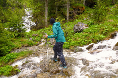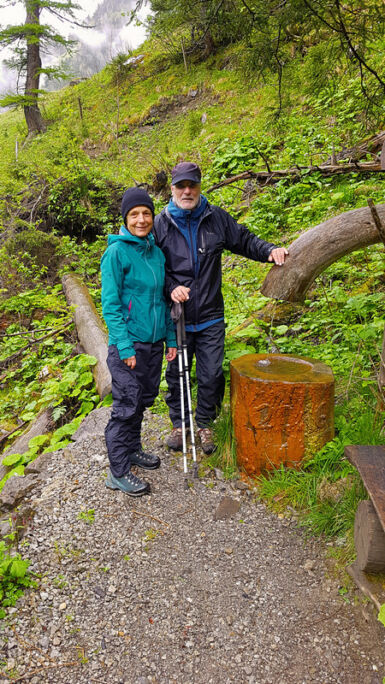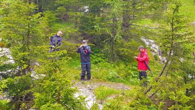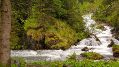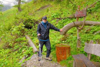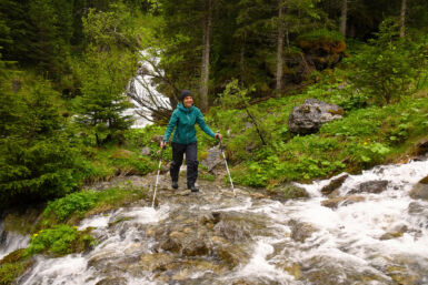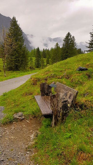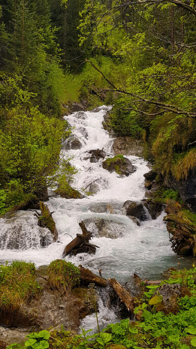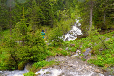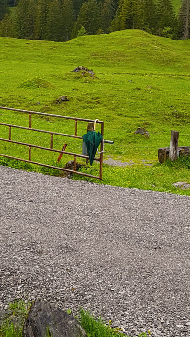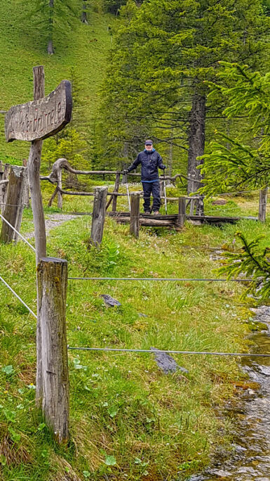Vom Alpengasthof Gamperdona hat man einen guten Blick auf den Kaskadenwasserfall Stübafall. Der breite Güterweg, der entlang der Meng zur Alp Güfel führt, streift zwar den Stübafall, aber von diesem Weg aus hat man keine gute Sicht auf den Wasserfall. Um dem Wasserfall etwas näher zu kommen, müssen wir auf der anderen Seite des Baches auf einem schmalen und nassen Pfad durch den Wald steigen. Aber so richtig nahe kommen wir dem Stübafall leider auch nicht. Dafür gibt es einen kleinen Rundweg zum Roten Brünnele.