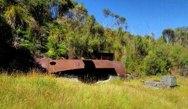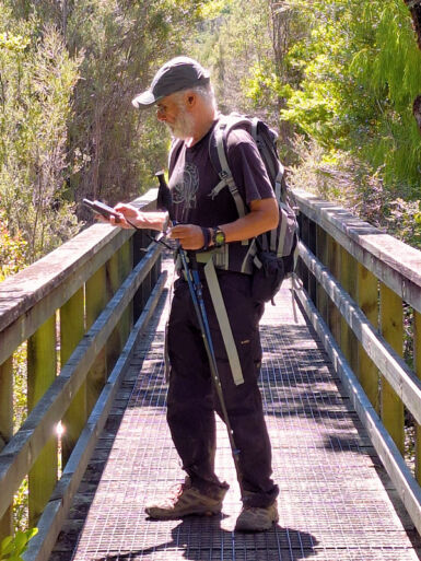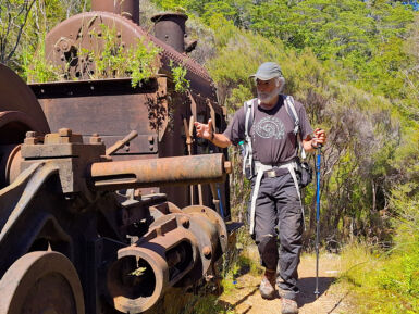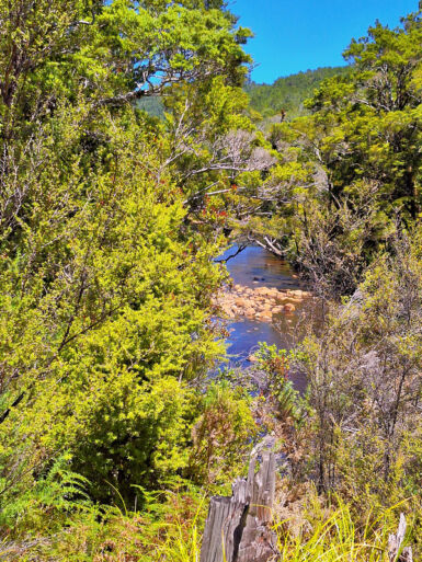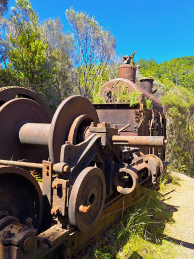 Auf einer Hängebrücke überqueren wir den Charming Creek und erreichen bald darauf die Ruinen der Watson’s Mill Sägemühle, deren Dampfkessel und andere rostige Relikte in der sich regenerierenden Buschlandschaft von Watson’s Mill liegen.