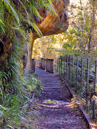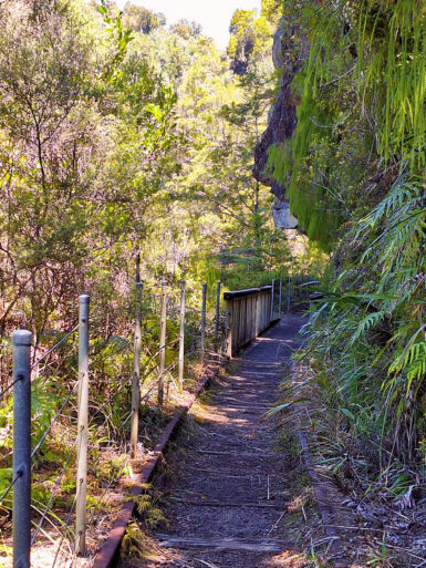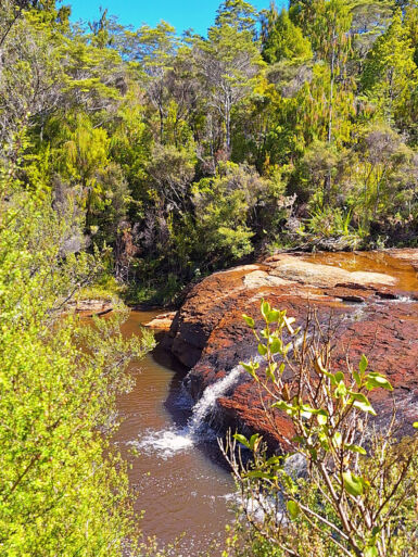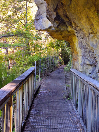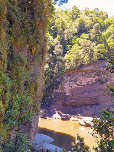Der nächste Abschnitt führt zur sogenannten Verandah und bietet spektakuläre Ausblicke auf den Fluss und die Upper Ngakawau Gorge. Wir erreichen den 50 Meter langen Mangatini Tunnel. Hier können wir vom Weg aus die beeindruckenden Mangatini Falls bewundern.
