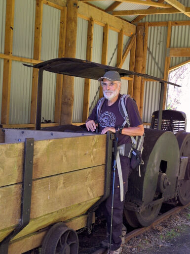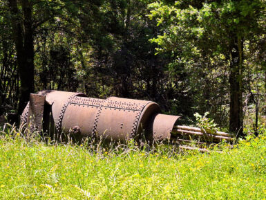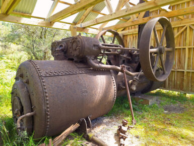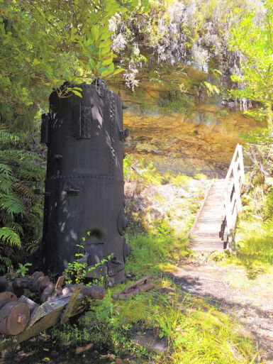 Auf einem breiten Weg geht es nun leicht bergab. Kurz vor einer Treppe steht ein alter Kessel im Gebüsch neben dem Weg. Wir erreichen Mumm’s Mill, eine historische Mühle. Hier können wir eine Dampflokomotive des Sägewerks, Draisinen und einen dampfbetriebenen Holzschlepper bestaunen.