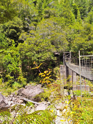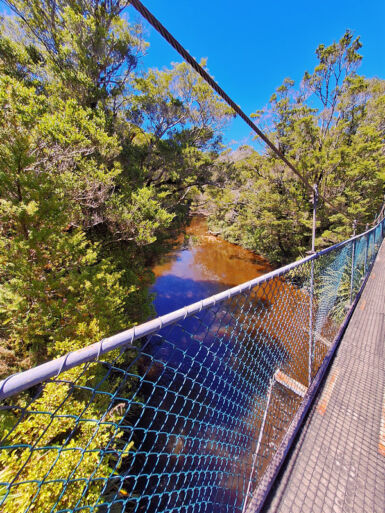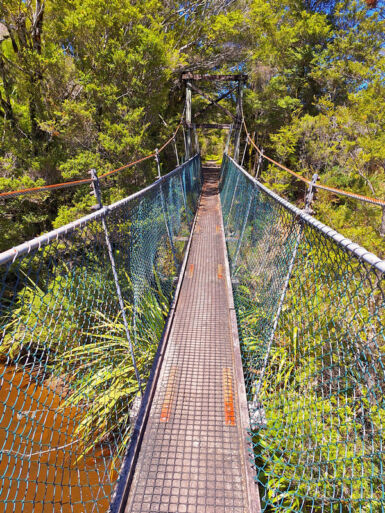 Kurz nach dem Tunnel erreichen wir die Hängebrücke über den Ngakawau River. Das Original stürzte 1934 ein, die neue Brücke wurde erst in den 1970er Jahren vom Militär errichtet.