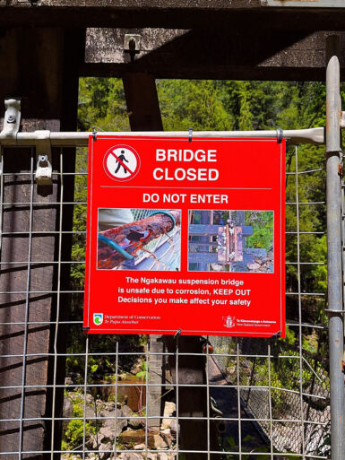 Die Brücke ist jedoch wegen Korrosionsschäden gesperrt. Auch der anschließende südliche Teil des Weges nach Ngakawau an der Westküste ist bis auf weiteres nicht passierbar. Wir kehren um und kehren glücklich zum Ausgangspunkt zurück.