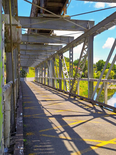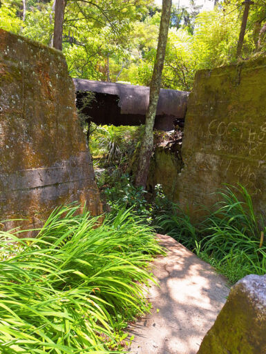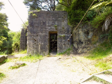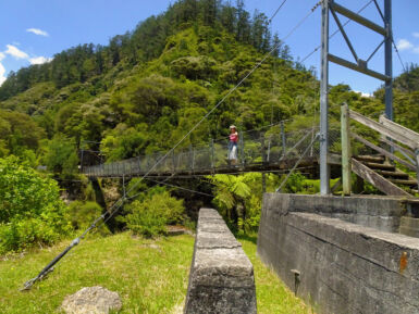 Zuerst überqueren wir die Hängebrücke über den Ohinemuri River und dann die Brücke über die Lower Waitawheta Gorge. Über Treppen steigen wir hinauf und durchqueren die verlassenen Gebäude und Maschinen der Talisman Batterie. Entlang einer Lorentrasse gelangen wir zu den alten Goldminenstollen und in einen Tunnel.