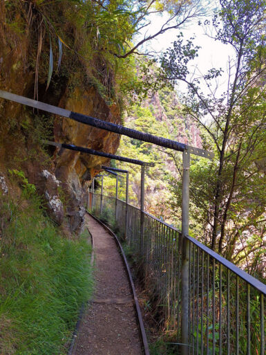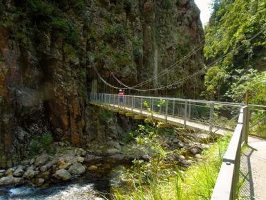 Nach dem Tunnel steigen wir über eine Treppe in die Schlucht hinab und überqueren den Fluss auf einer Hängebrücke. Auf der anderen Seite der Schlucht wollten wir eigentlich auf dem Crown Tramway Track weitergehen, aber der ist wegen Steinschlag und Erdrutschen gesperrt.
