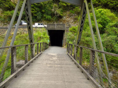 Neuseeland: Spannende Wanderung in der Karangahake Gorge durch Busch, über Brücken und durch einen 1100 m langen stillgelegten Eisenbahntunnel.