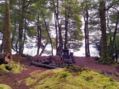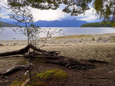 Der Wanderweg befindet sich im Wald, gleich oberhalb des Strandes. Dort befindet sich ein offizieller Campingplatz für den Kepler Track. Wir trennen uns hier: Annette wandert die erste Etappe des Kepler Track zur Luxmore Hut, Dieter folgt dem Uferweg des Kepler Track zurück nach Te Anau.