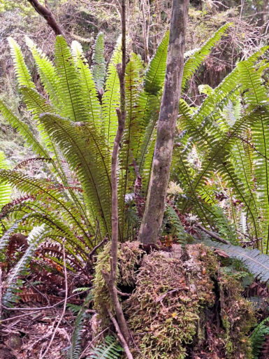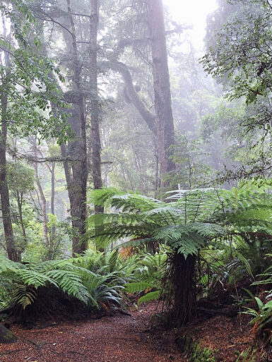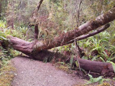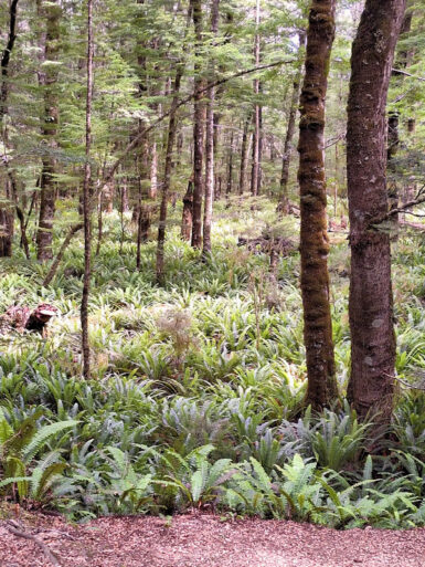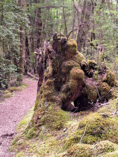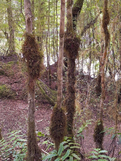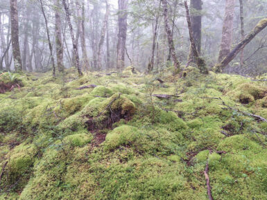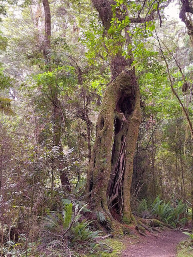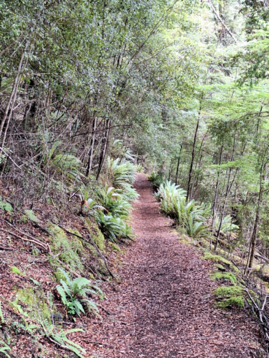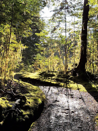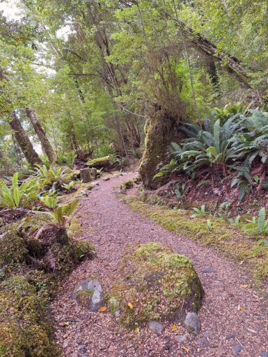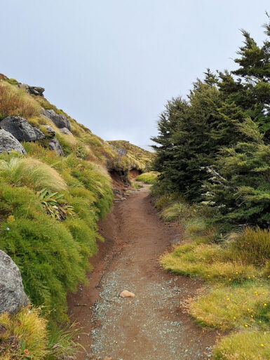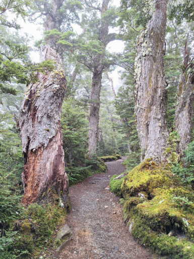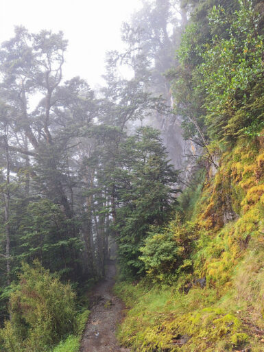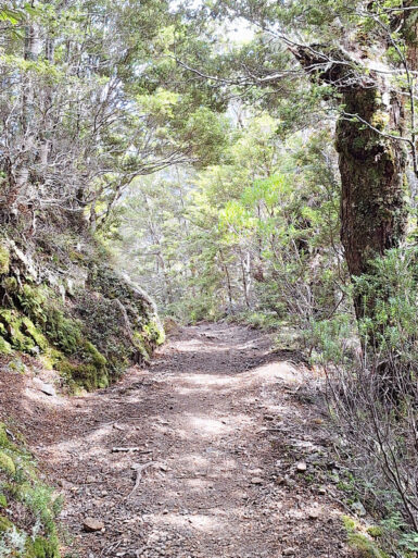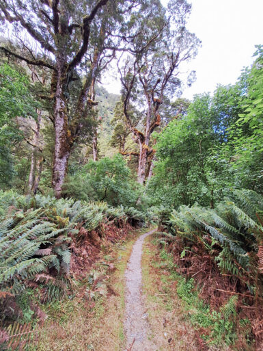 Von Broad Bay aus beginnt der lange Aufstieg auf den Berg: Innerhalb weniger Kilometer muss ich über 800 Höhenmeter überwinden. Zwischen Moos und den allgegenwärtigen Südbuchen wandere ich auf einem gut ausgebauten, in engen Serpentinen ansteigenden Pfad bergauf. Dennoch bleibt der Weg für mich gemütlich.