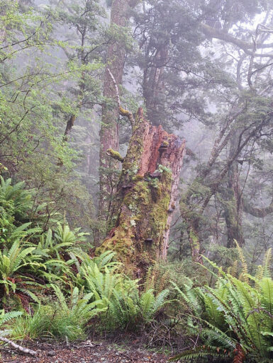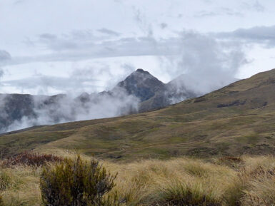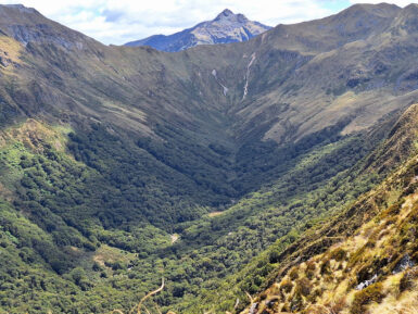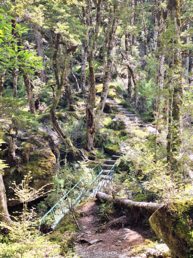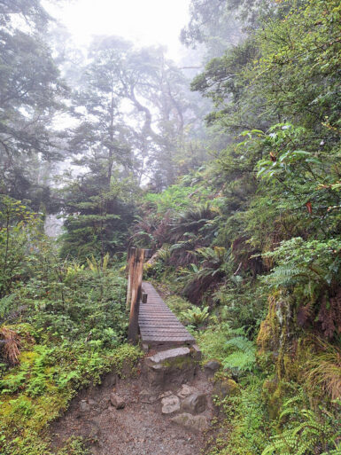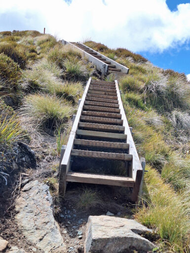 Der erste Teil des Abstiegs verläuft über einen schmalen Grat. Das DOC hat an einigen Stellen Treppen eingebaut, aber sie sind steil und so bleibt der Weg anspruchsvoll und erfordert volle Konzentration. Auf etwa 1.100 Metern erreiche ich wieder die Baumgrenze. Das vertraute Braun des Tussock-Grases weicht sattem Grün – Farne, Moose und dichter Wald lösen die karge Hochgebirgslandschaft ab.